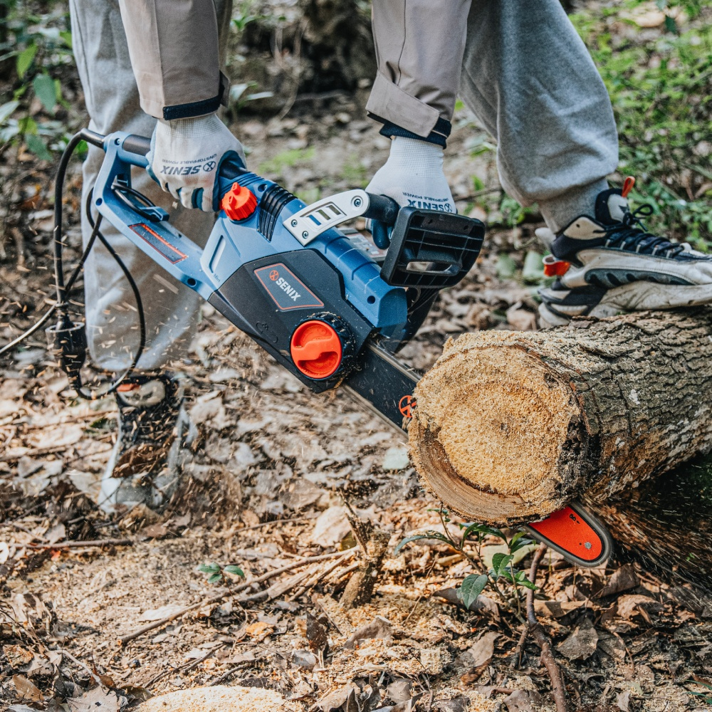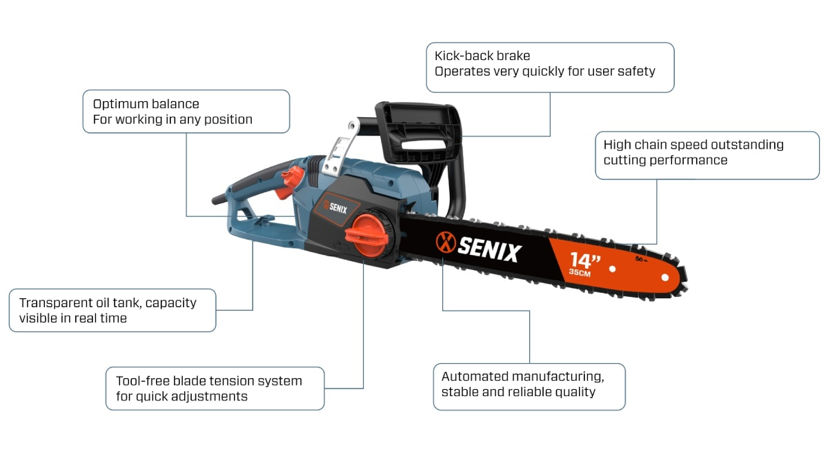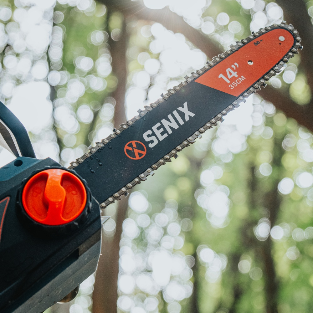 (5.0)The SENIX 2000W 35cm (14”) Chain Saw delivers reliable and efficient cutting for home and garden users. With 15.2 m/s chain speed, kick-back brake, and tool-free SDS chain tensioning, it ensures safe, fast, and precise cutting. Lightweight and ergonomically balanced, this chainsaw is perfect for pruning, firewood cutting, and general yard maintenance in any working position.