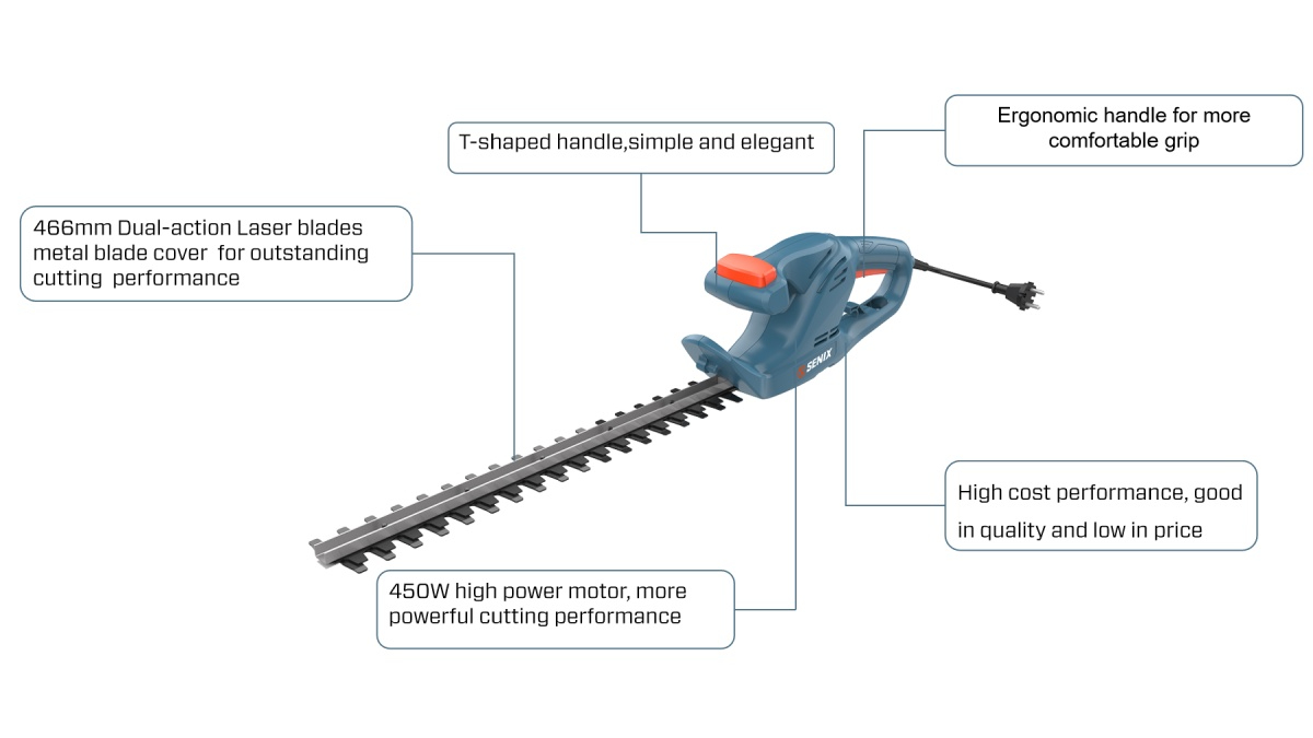 (5.0)The SENIX 450W Hedge Trimmer delivers professional-level hedge care with ease and precision. Featuring 466mm dual-action blades, a powerful 450W motor, and a comfortable T-shaped handle, it trims branches up to 18mm effortlessly. Lightweight and CE-certified, this trimmer ensures smooth, safe, and controlled cutting for homeowners and landscapers seeking reliable performance and ergonomic design.