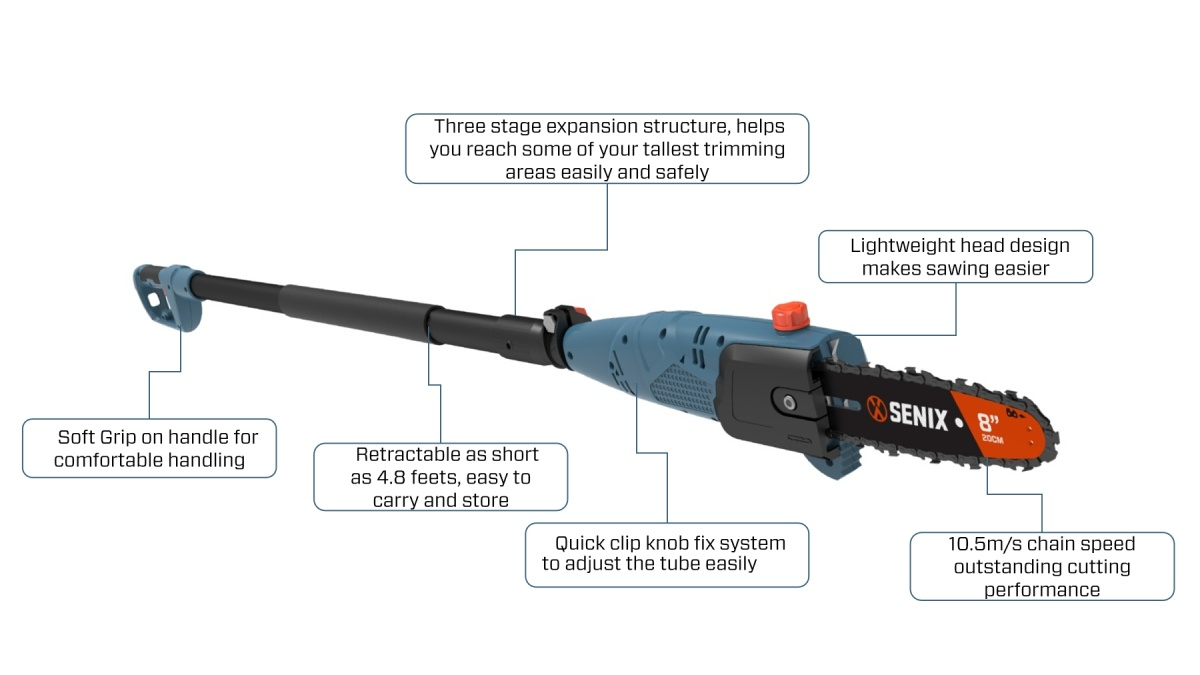 Trimming tree branches at height: Safely reach and cut overhead limbs without the need for a ladder.
