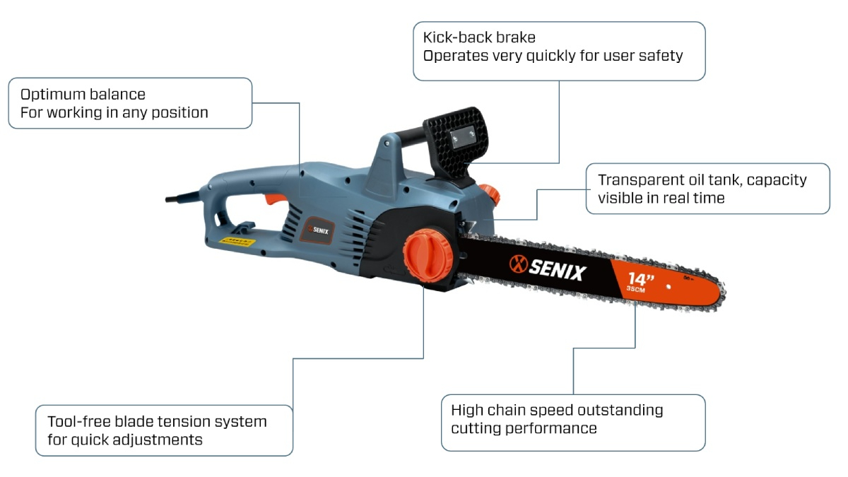 (5.0)The SENIX 1800W 35cm (14”) Chain Saw offers lightweight yet powerful performance for home and garden tasks. With a 14 m/s chain speed, kick-back brake, and tool-free SDS chain tensioning, it provides safe, precise, and efficient cutting. Ergonomically balanced and easy to handle, this chainsaw is perfect for pruning, firewood cutting, and general yard maintenance.