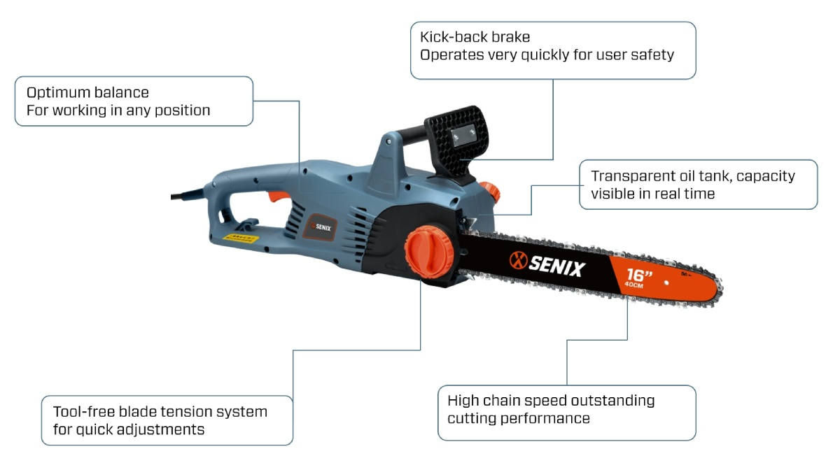 (5.0)The SENIX 2000W 40cm (16”) Chain Saw offers reliable performance, safety, and convenience for medium-duty cutting tasks. Equipped with a 14.5 m/s chain speed, kick-back brake, and tool-free SDS chain tensioning, it delivers efficient and precise cuts. Lightweight and ergonomically balanced, it's ideal for pruning branches, cutting firewood, and general garden work in any position.