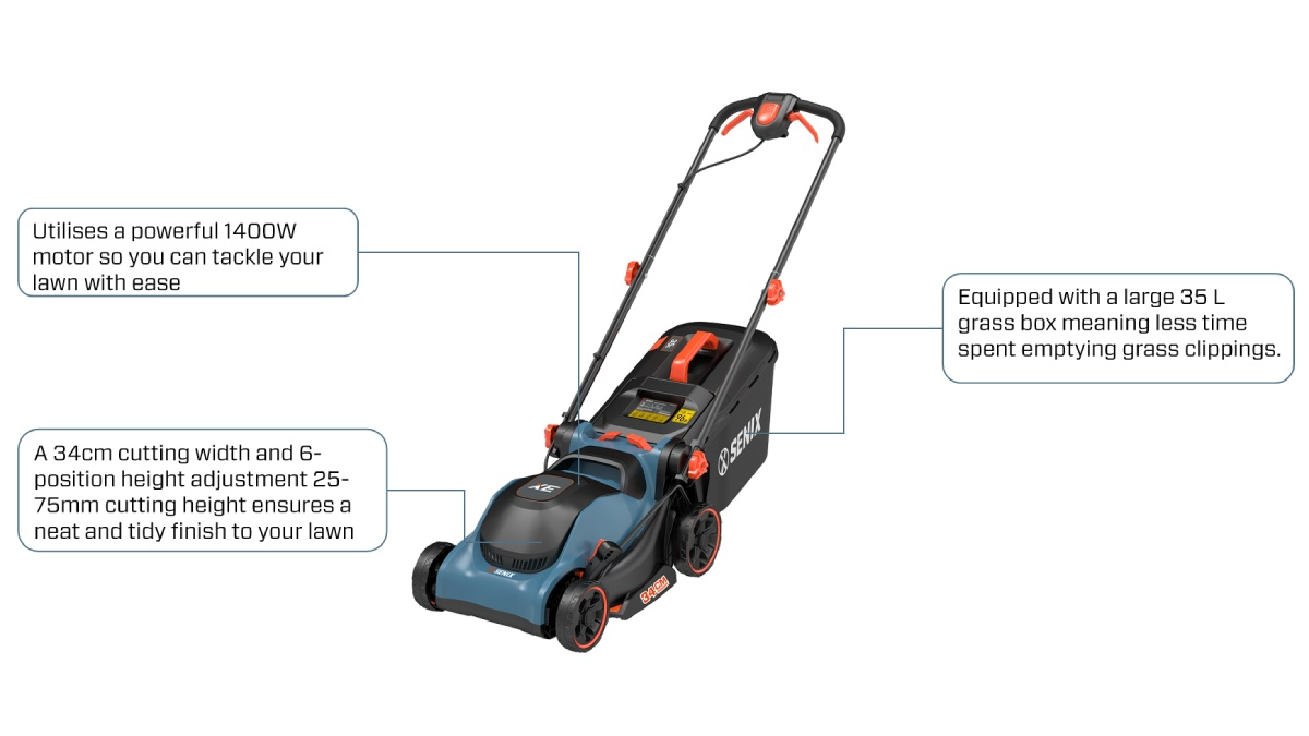 Utilises a powerful 1400W motor so you can tackle your lawn with ease