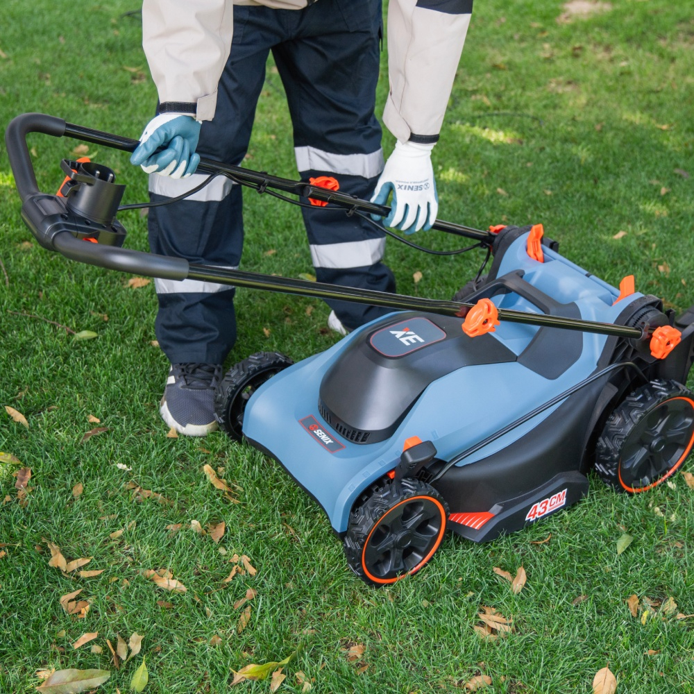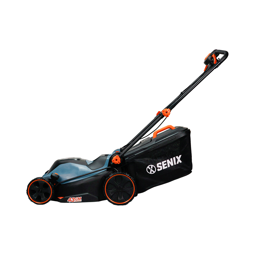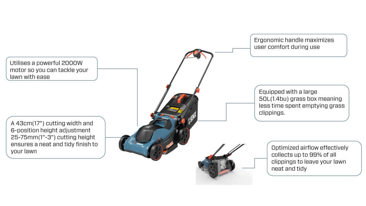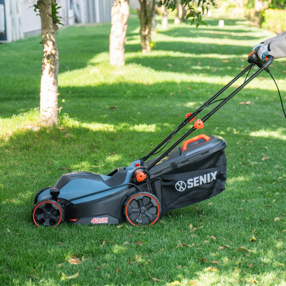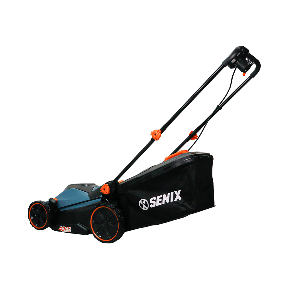 Senix electric mower features a 2000W motor for effortless lawn care, with a 43cm cutting width and 6-position height adjustment for precise results. Its ergonomic handle ensures comfort, while the 50L grass box reduces emptying frequency. Optimized airflow collects up to 99% of clippings for a neat finish.