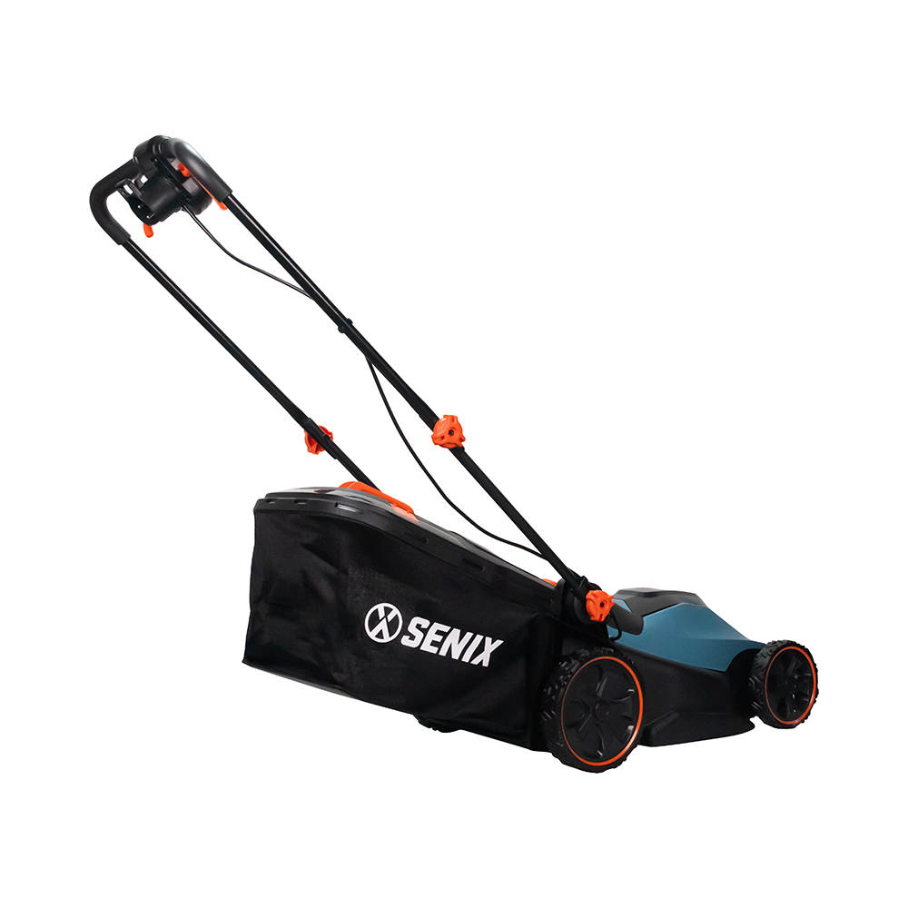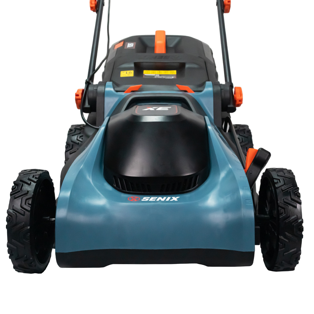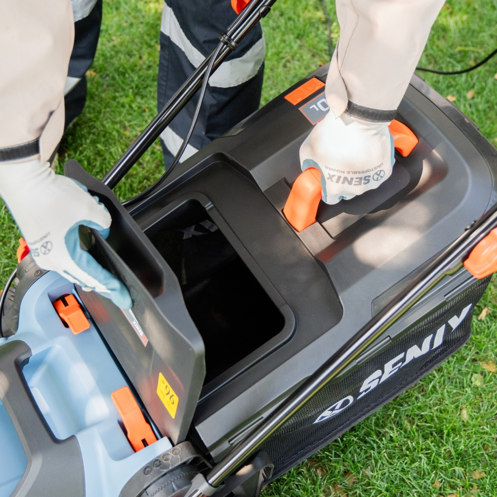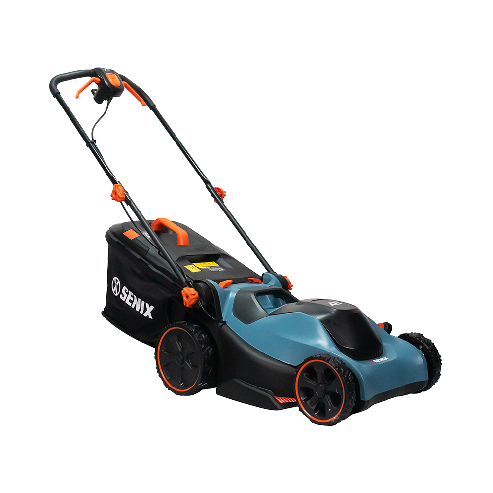 Senix electric mower features a 2000W motor for effortless lawn care, with a 43cm cutting width and 6-position height adjustment for precise results. Its ergonomic handle ensures comfort, while the 50L grass box reduces emptying frequency. Optimized airflow collects up to 99% of clippings for a neat finish.