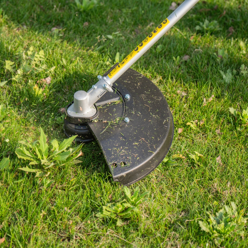 A:This is a more powerful class of tool known as a brush cutter. The key difference is its ability to use a rigid metal blade in addition to a trimmer head, allowing it to cut through much thicker and woodier vegetation that would stall a standard string trimmer.