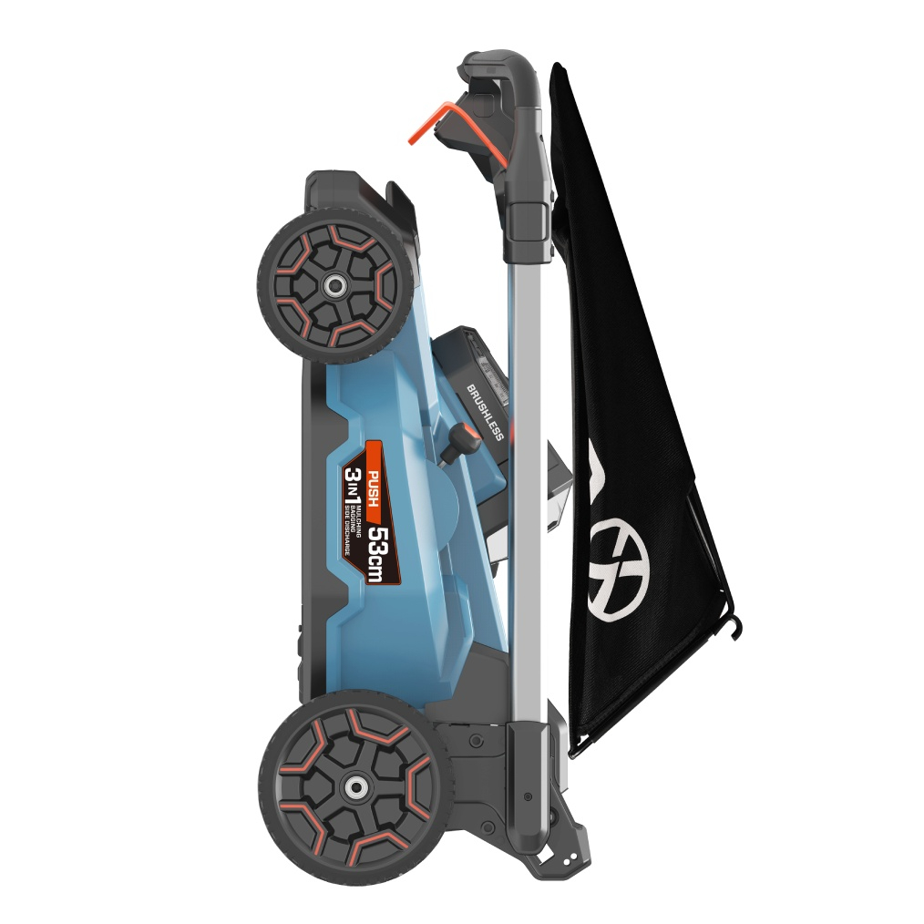 With the included 60V 6.0Ah battery, users can enjoy up to 60 minutes of runtime, efficiently covering up to 2000m² of lawn on a single charge. Its 3-in-1 functionality—mulching, side discharge, and bagging—offers flexible mowing modes for all yard preferences. The 53cm (21”) wide deck and 60L grass bag help reduce time spent mowing and emptying.