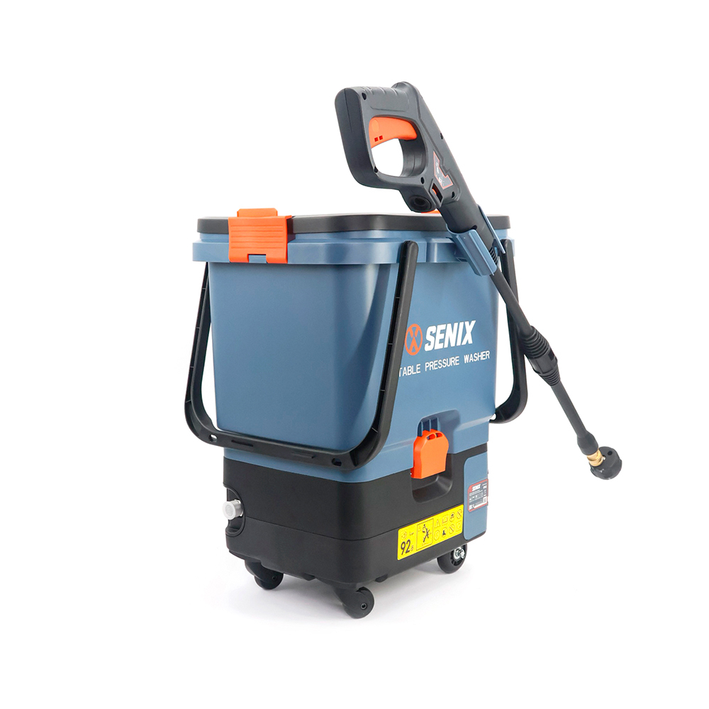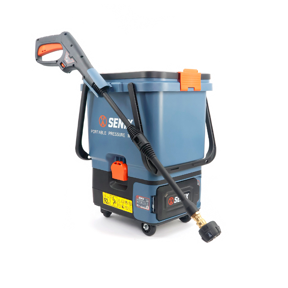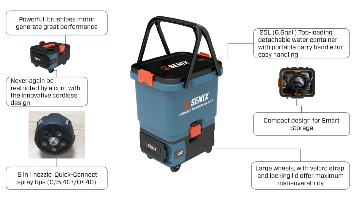 The SENIX 40V Brushless Portable Pressure Washer is equipped with a high-performance brushless motor, delivering up to 70Bar working pressure and 3.8L/min flow. Its cordless design, powered by dual 20V Max batteries, frees you from restrictive cords, while the 25L detachable top-loading water container offers on-the-go cleaning. A 5-in-1 nozzle with Quick-Connect spray tips adapts to different cleaning needs, and large wheels with a locking lid ensure easy transport and secure storage.