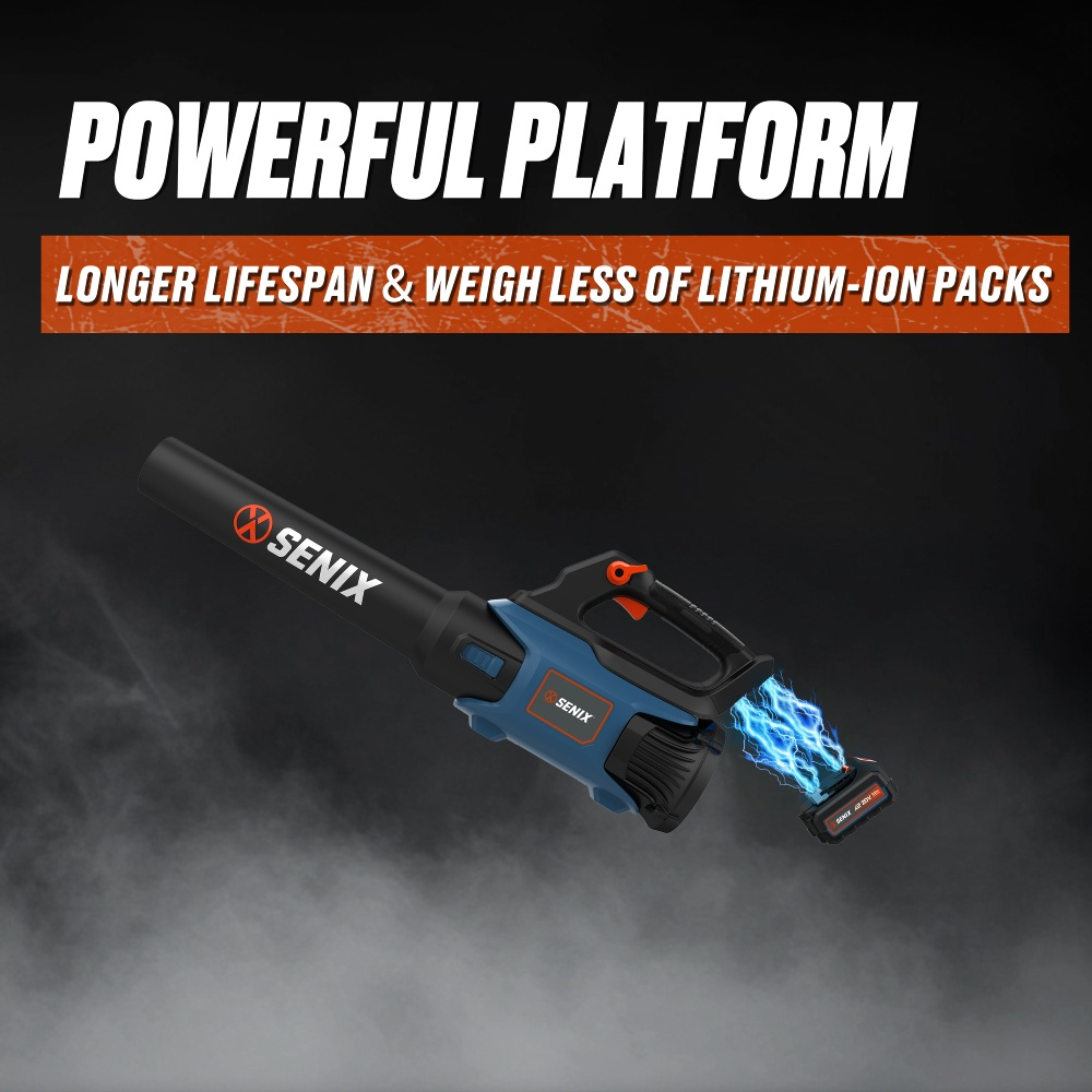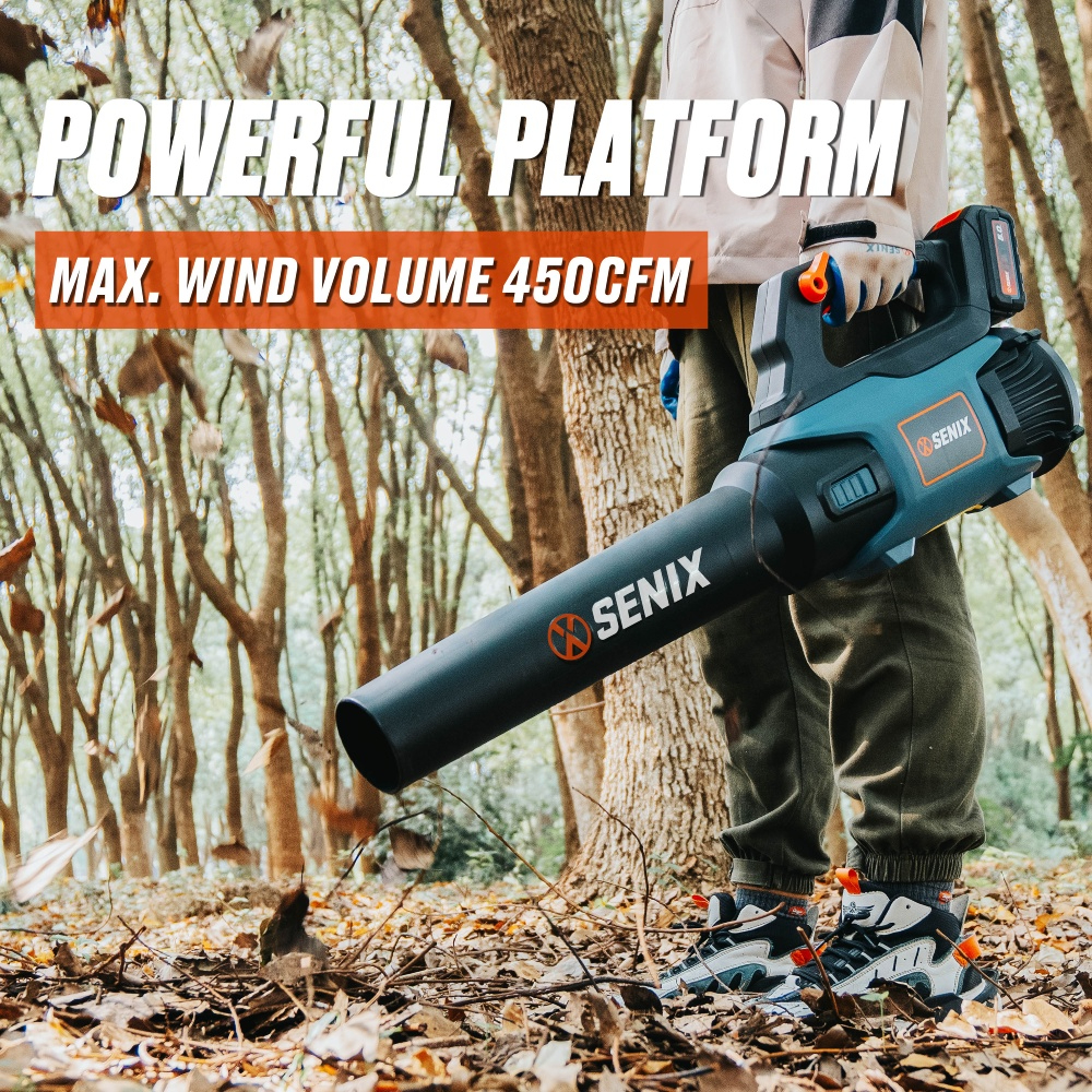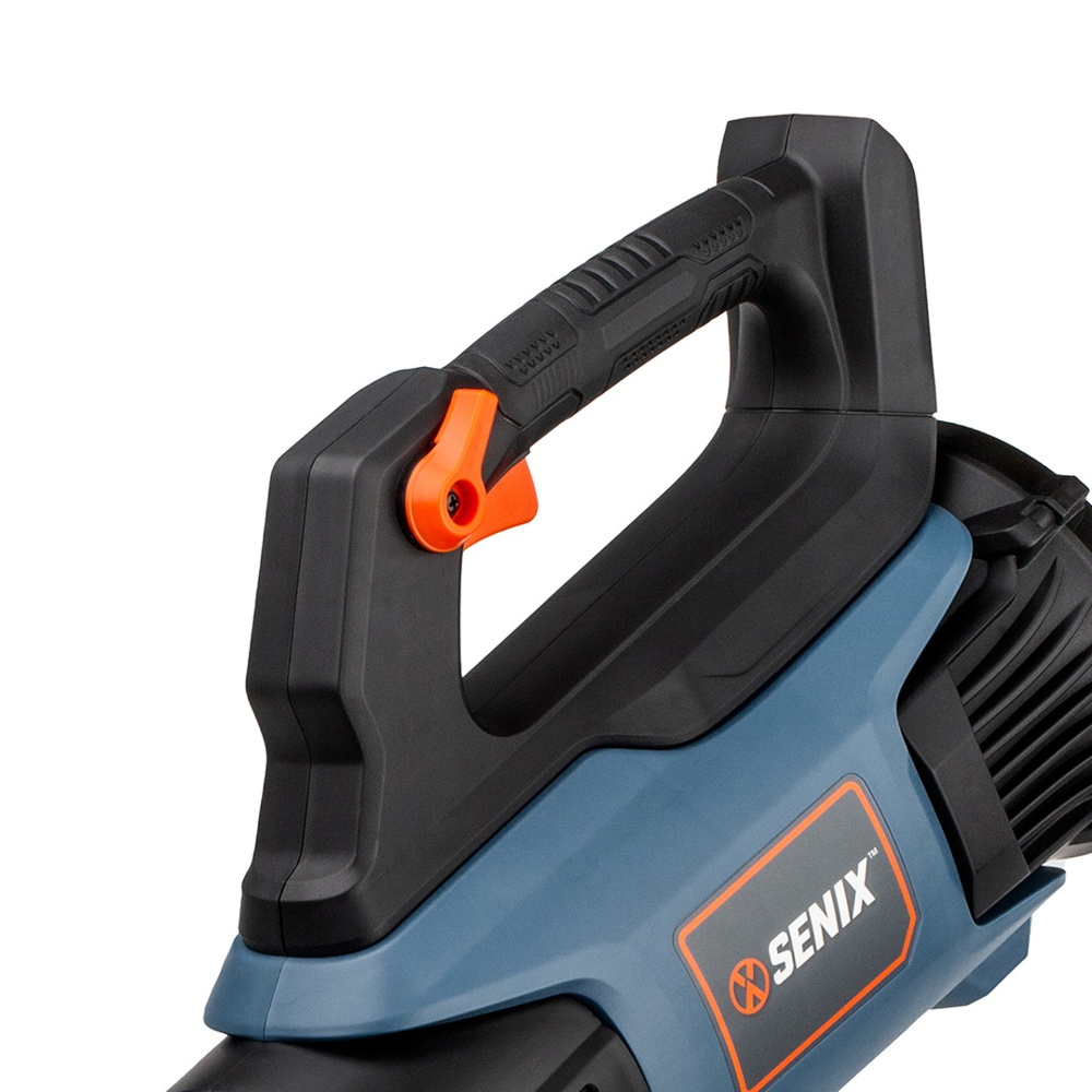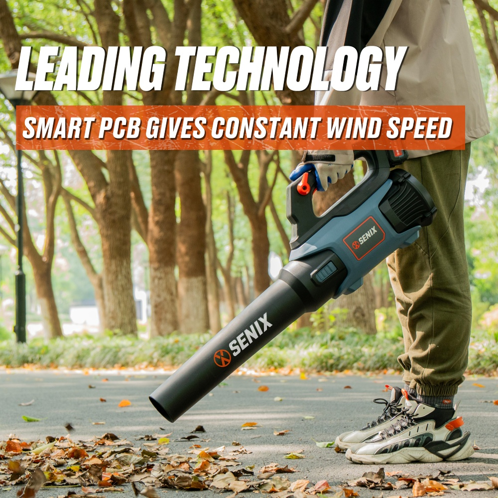 (5.0)The SENIX 20V Brushless 765m³/h (450 CFM) Blower combines power, precision, and comfort in a lightweight design. Featuring a brushless motor, smart PCB for constant wind speed, variable speed trigger with cruise control, and ergonomic soft-grip handle, it delivers efficient airflow up to 160 km/h. Rear-mounted battery ensures superior balance, and X2 compatibility makes it perfect for yard maintenance.