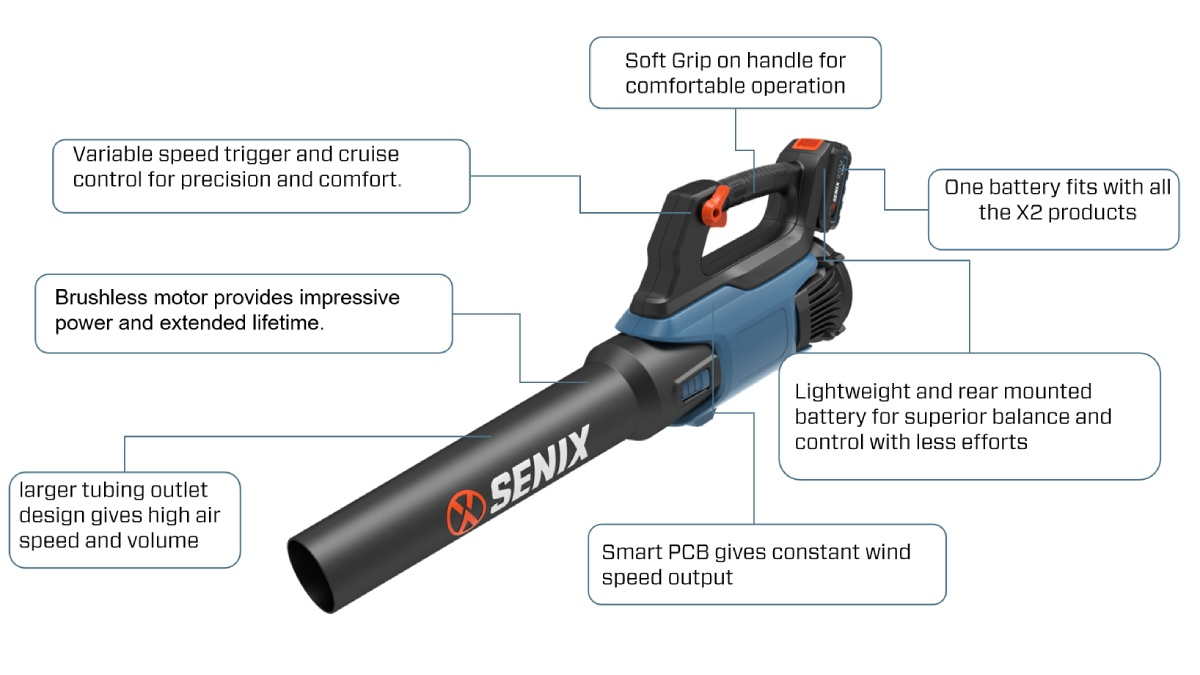 Users experience a reliable, easy-to-use blower that combines power, control, and comfort. It is ideal for yard maintenance, workshop cleanup, and drying surfaces. X2 battery compatibility adds convenience and cost efficiency, allowing the same battery to power multiple SENIX tools. Tested for consistent performance, the blower provides a controlled and powerful airflow suitable for delicate areas and larger debris alike. CE/CB certification ensures safety and quality, making the SENIX 20V Brushless 765m³/h Blower a versatile and dependable solution for homeowners and light-duty professionals.