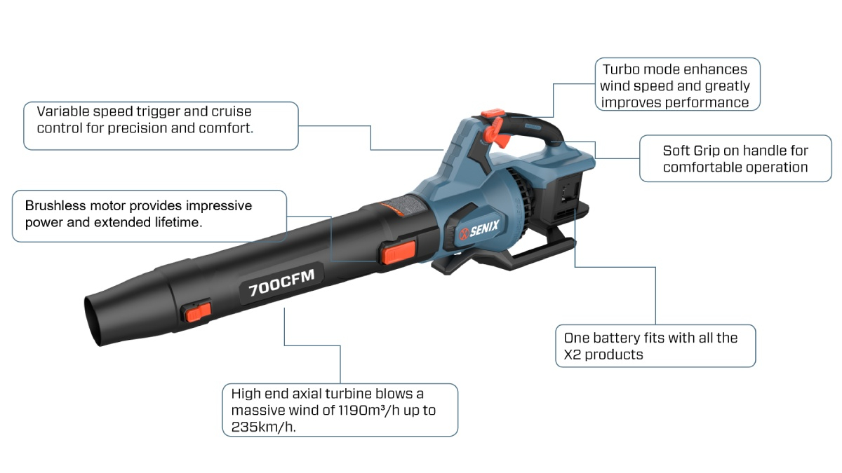 The SENIX 40V Brushless 1190m³/h (700 CFM) Blower features a high-end axial turbine, brushless motor, turbo mode, variable speed trigger, and cruise control. It generates powerful airflow up to 235 km/h while maintaining lightweight, ergonomic operation at just 2.5kg. Its soft-grip handle enhances comfort, and X2 battery compatibility allows one battery to power multiple SENIX tools.