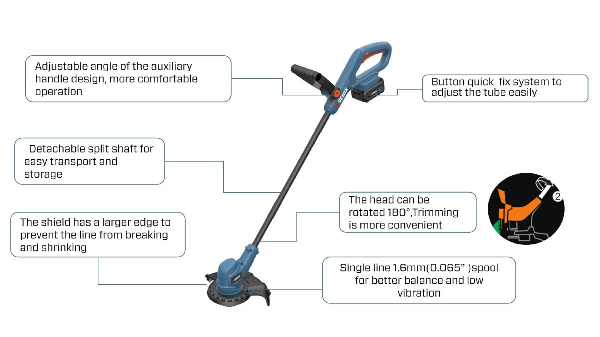 A 180° rotating head allows you to easily switch between trimming and edging, while the adjustable-angle auxiliary handle offers comfortable operation from different positions. The button quick-fix system makes length adjustments fast and tool-free, ensuring you can adapt to various tasks on the go. The large-edge shield protects the line from premature breakage, improving efficiency and reducing downtime.
