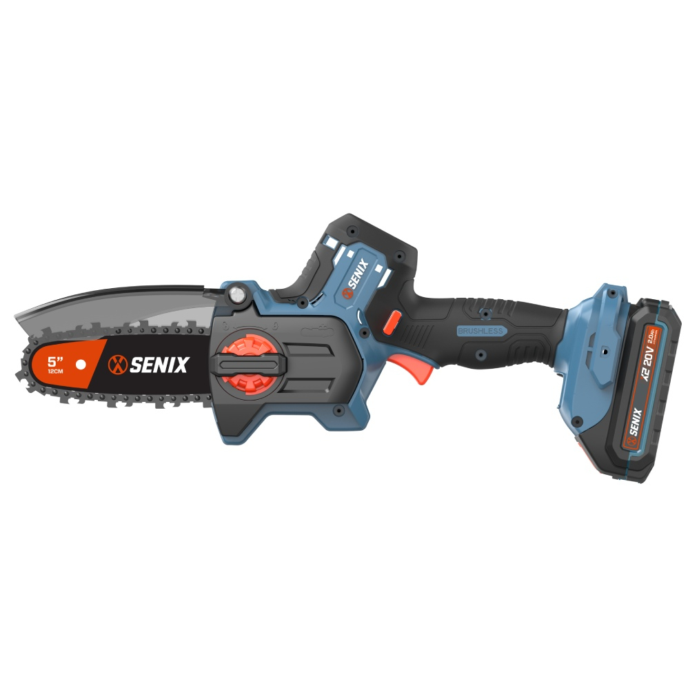 (5.0)The SENIX 20V Brushless 12cm (5") Pruning Saw is a lightweight, compact tool designed for precision and ease of use. Featuring a brushless motor for long life and quiet operation, an 8m/s high-speed chain, SDS tool-free tension system, and protective cover, it delivers safe, efficient pruning. X2 battery compatibility makes it ideal for garden and DIY woodcutting tasks.