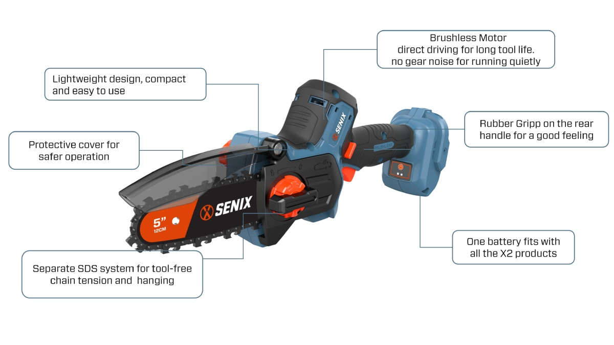 The SENIX 20V Brushless 12cm (5") Pruning Saw combines precision, safety, and portability. Its brushless motor provides long tool life and quiet operation, while the high-speed 8m/s chain ensures smooth, accurate cutting. A rubberized rear handle enhances comfort, and the protective cover improves safety. The separate SDS system allows tool-free chain tensioning and hanging. Its compact, lightweight 1.1kg design ensures easy maneuverability, and X2 battery compatibility allows one battery to power multiple SENIX tools.
