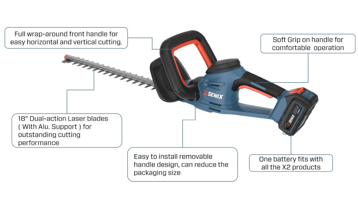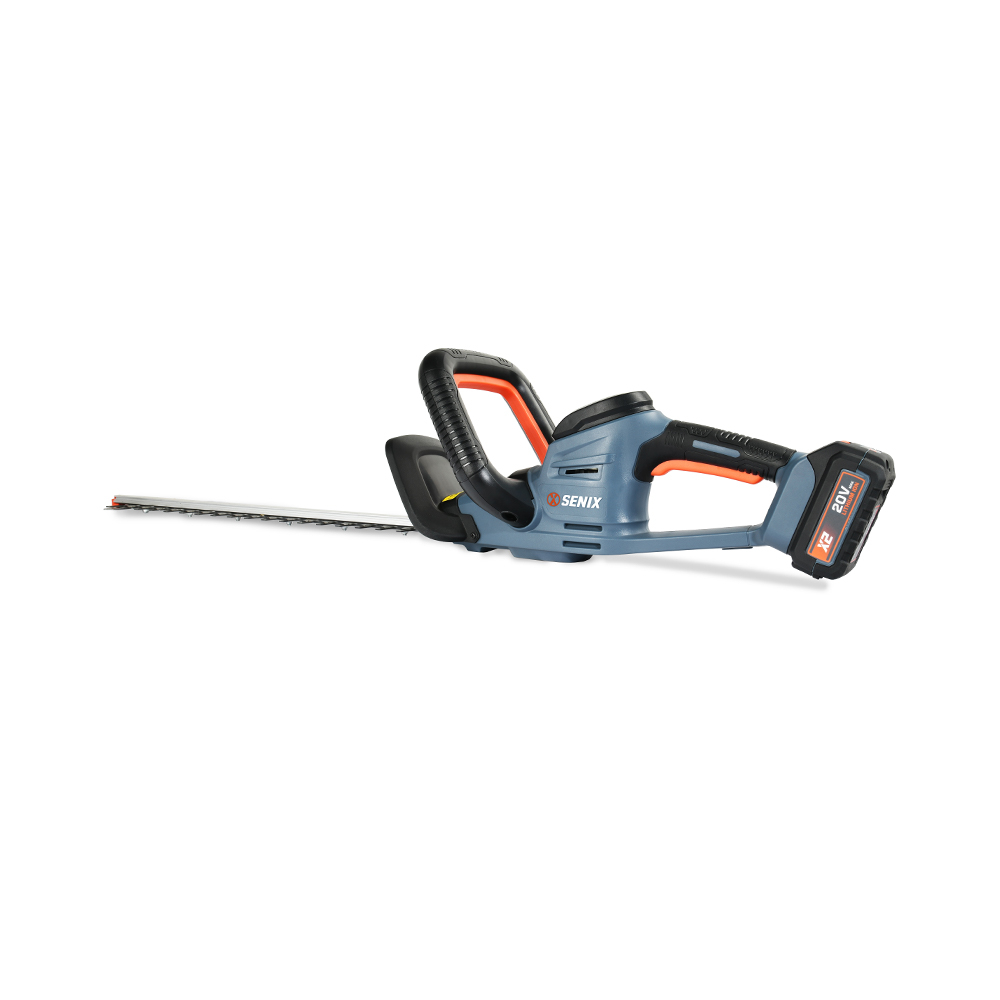 The SENIX 20V Cordless Hedge Trimmer delivers professional-grade performance for residential and light commercial use. With its 18-inch dual-action laser-cut blades supported by aluminum reinforcement, this trimmer provides clean, precise cuts through branches up to 20mm thick. The 20V brushed motor generates 2300 strokes per minute (SPM), ensuring efficient trimming of hedges, shrubs, and ornamental plants.