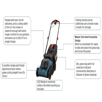 The SENIX 40V Cordless 34cm Lawnmower comes equipped with twin 4.0Ah batteries for longer runtime, a 34 cm cutting width, and a 35L grass bag with full collection indicator. Its brushed motor operates at ECO 3000 RPM or 3500 RPM for efficient mowing. The mower supports 2-in-1 mowing (bagging and mulching) and offers a 5-position height adjustment from 25 to 75 mm. Front/rear wheels measure 14/16 cm, and ECO Mode maximizes battery life during touch-ups.