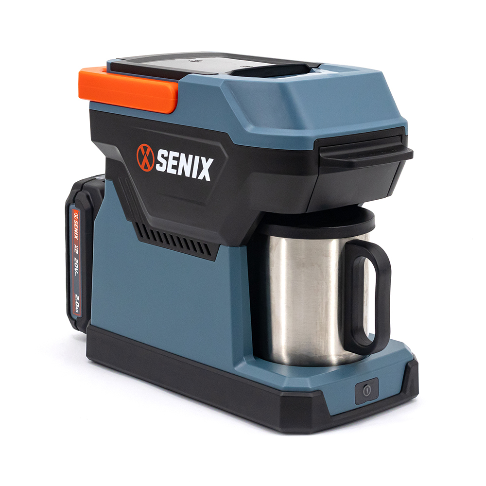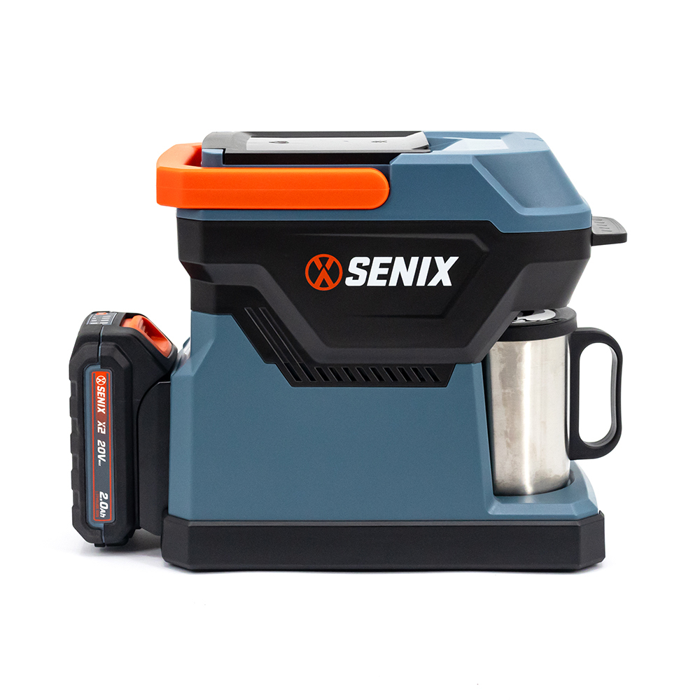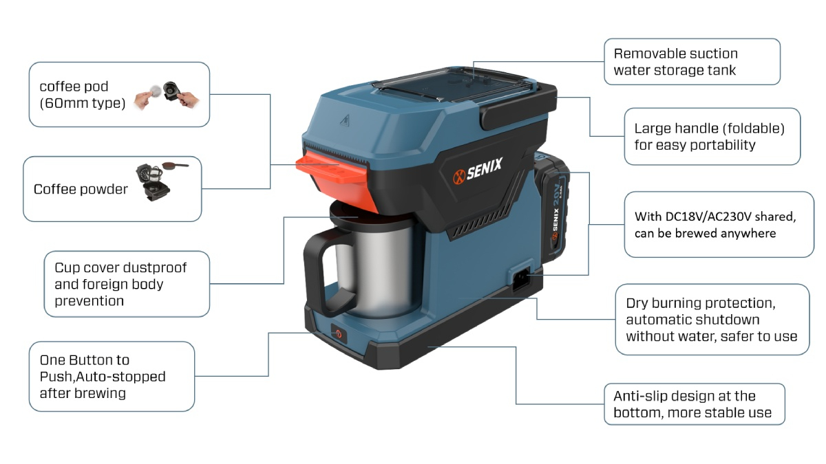 The SENIX DC/AC Hybrid Coffee Maker is designed for coffee lovers on the go, blending convenience with high-quality brewing performance. Compatible with 60mm coffee pods and ground coffee, it offers a quick 6-8 minute brew time with a movable water tank for effortless cleaning. Powered by a 20V Max battery or AC 230V, this versatile coffee maker is ideal for use at home, office, or outdoors. Its large foldable handle ensures easy portability, while the anti-slip base guarantees stability during use. Safety is prioritized with dry burning protection that automatically shuts down the device when water runs low. The cup cover keeps your coffee clean and free from dust or foreign objects. With a 240ml tank capacity, it can brew multiple cups—up to four with a 5.0Ah battery—making it perfect for personal or small group use. Compact and user-friendly, this coffee maker combines efficiency, safety, and portability into one smart appliance.