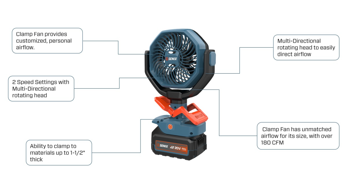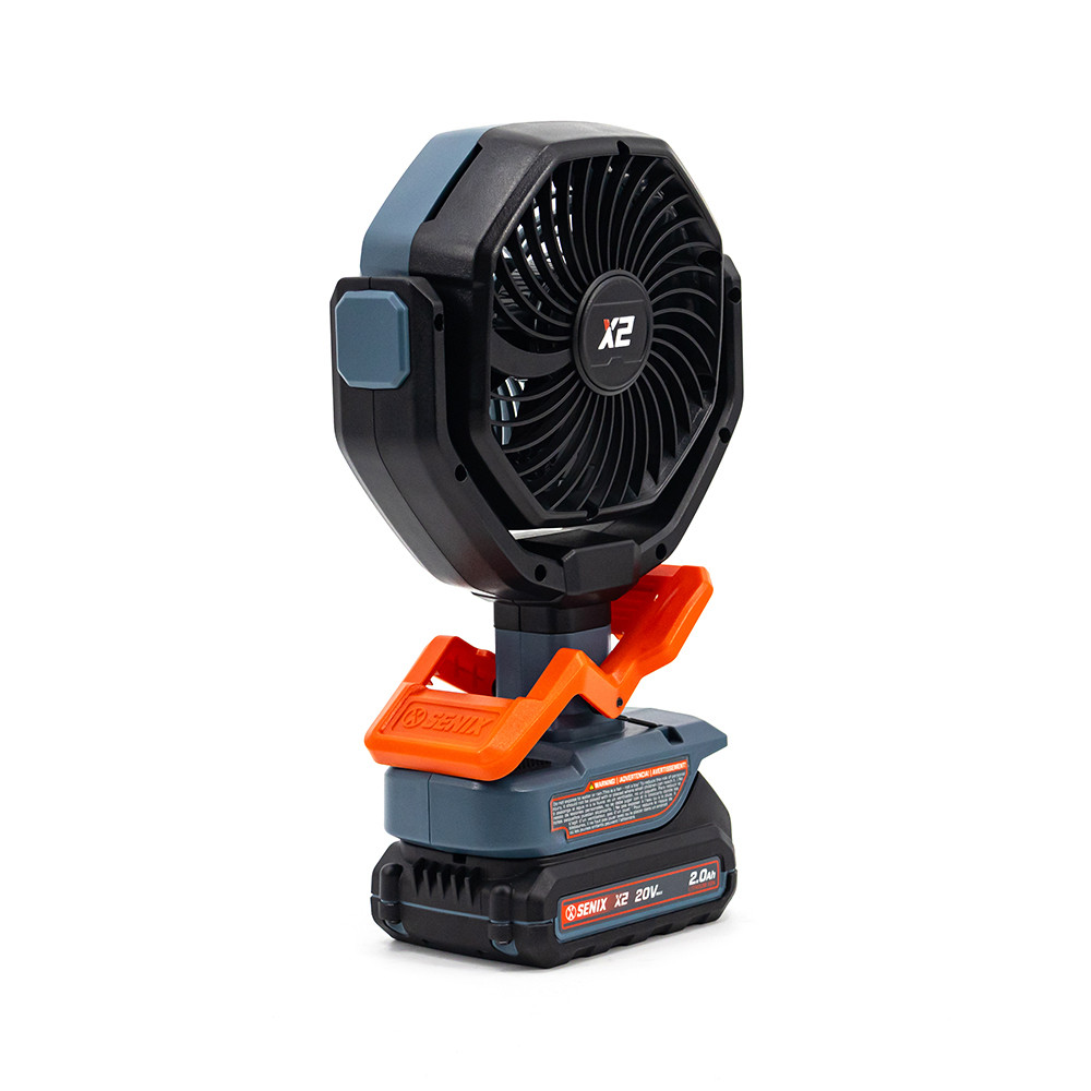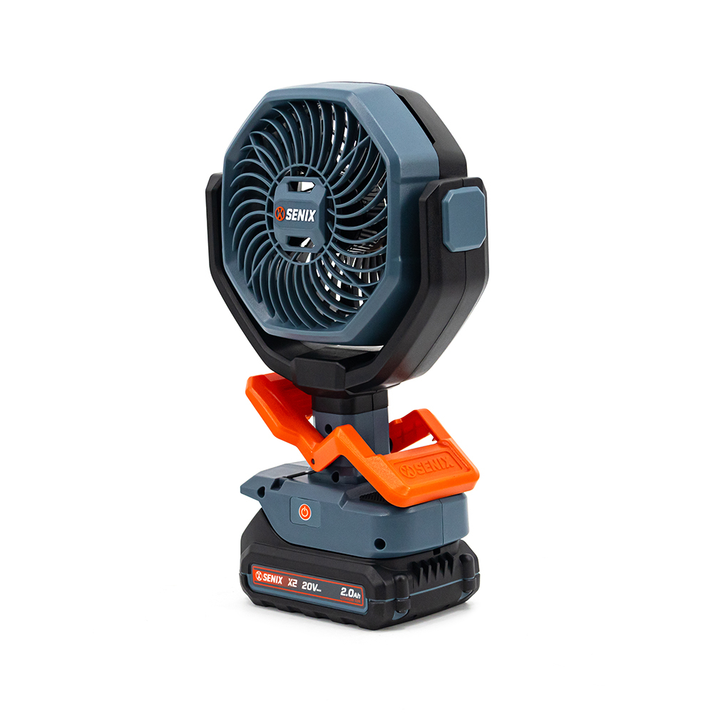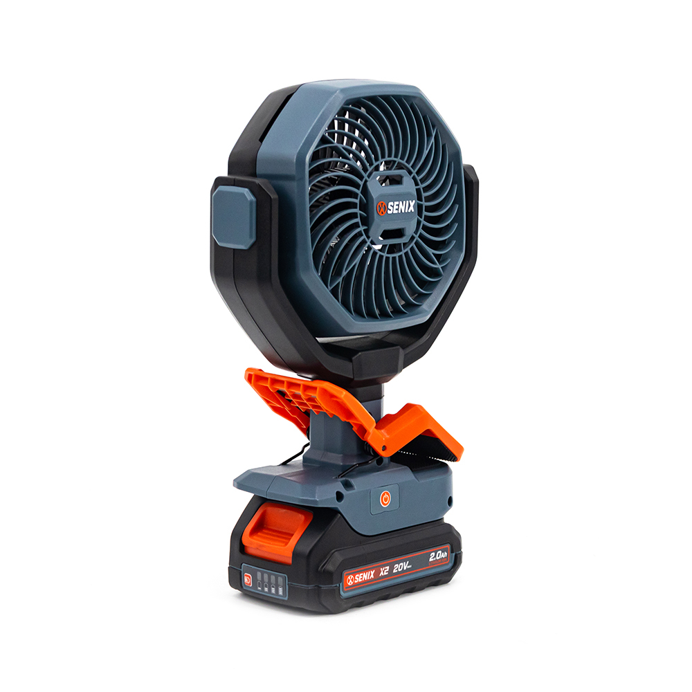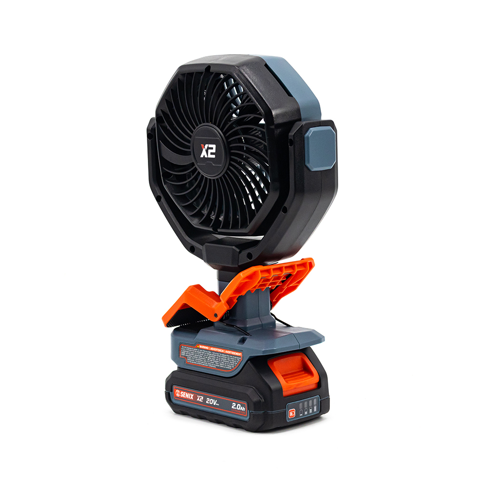 The SENIX 20V Brushless Clamp Fan is a compact yet powerful cooling solution designed to provide personalized airflow wherever you need it. Featuring a robust brushless motor, this fan offers two-speed settings and an impressive airflow of over 80 CFM, ensuring efficient cooling for workspaces, workshops, or outdoor environments. Its multi-directional rotating head with a 290° pivoting angle and 300° bracket rotation provides exceptional flexibility, allowing you to direct air precisely where it's needed. The fan clamps securely onto materials up to 1-1/2" thick, making it perfect for mounting on tables, benches, or equipment. With an extended runtime of up to 18 hours on a single 5.0Ah battery, it supports long-lasting, uninterrupted cooling. Lightweight and easy to move, the SENIX Clamp Fan is an ideal companion for professionals seeking comfort and control in any setting. Certified with CE standards, it assures both safety and reliability.