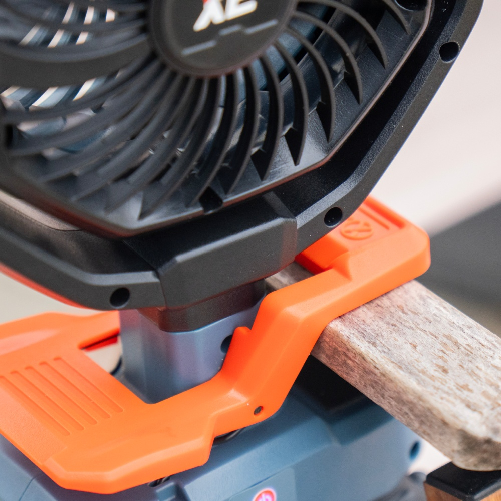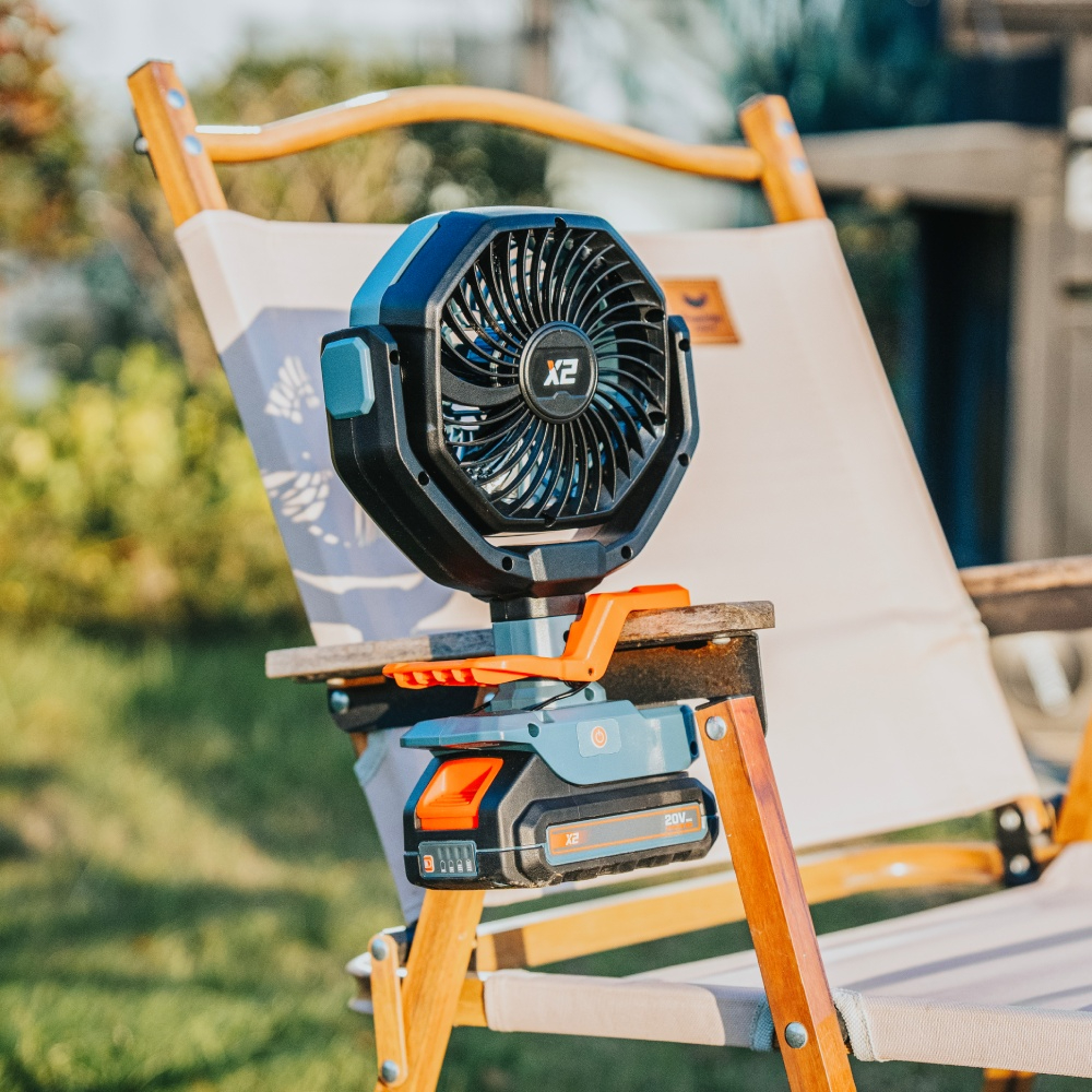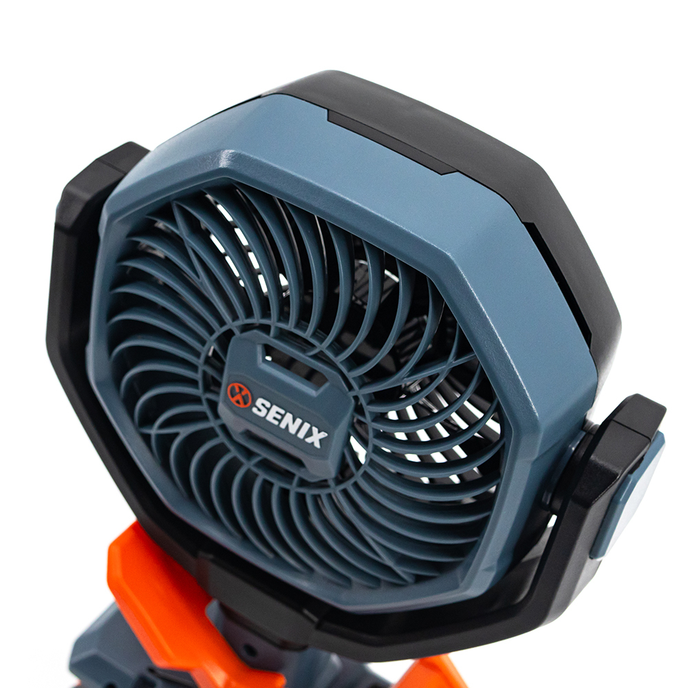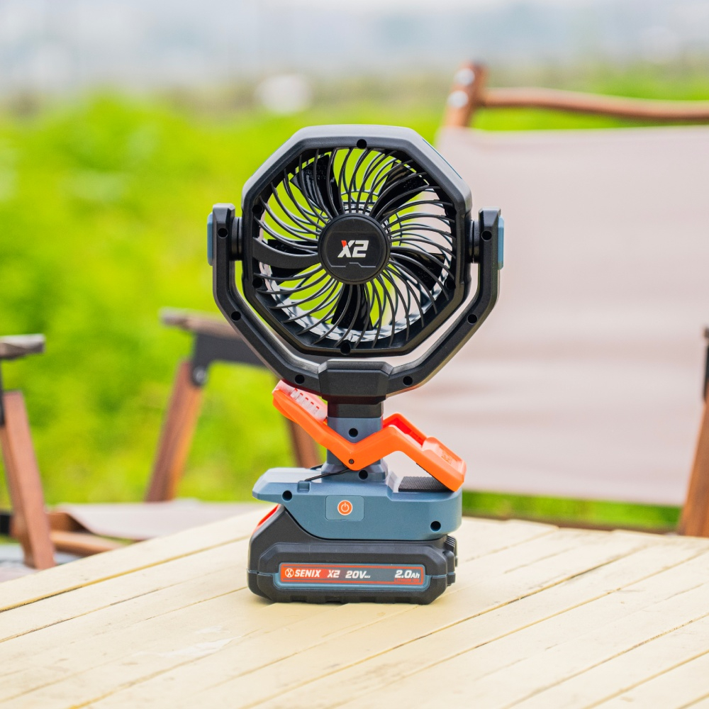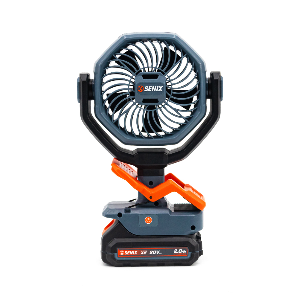 The SENIX 20V Brushless Clamp Fan is a compact yet powerful cooling solution designed to provide personalized airflow wherever you need it. Featuring a robust brushless motor, this fan offers two-speed settings and an impressive airflow of over 80 CFM, ensuring efficient cooling for workspaces, workshops, or outdoor environments. Its multi-directional rotating head with a 290° pivoting angle and 300° bracket rotation provides exceptional flexibility, allowing you to direct air precisely where it's needed. The fan clamps securely onto materials up to 1-1/2" thick, making it perfect for mounting on tables, benches, or equipment. With an extended runtime of up to 18 hours on a single 5.0Ah battery, it supports long-lasting, uninterrupted cooling. Lightweight and easy to move, the SENIX Clamp Fan is an ideal companion for professionals seeking comfort and control in any setting. Certified with CE standards, it assures both safety and reliability.