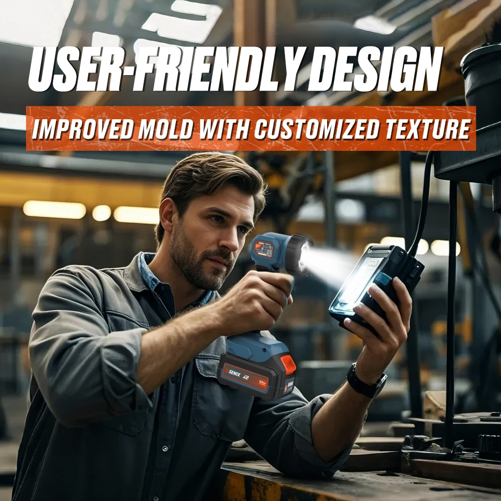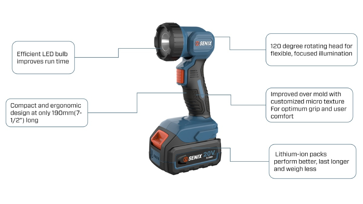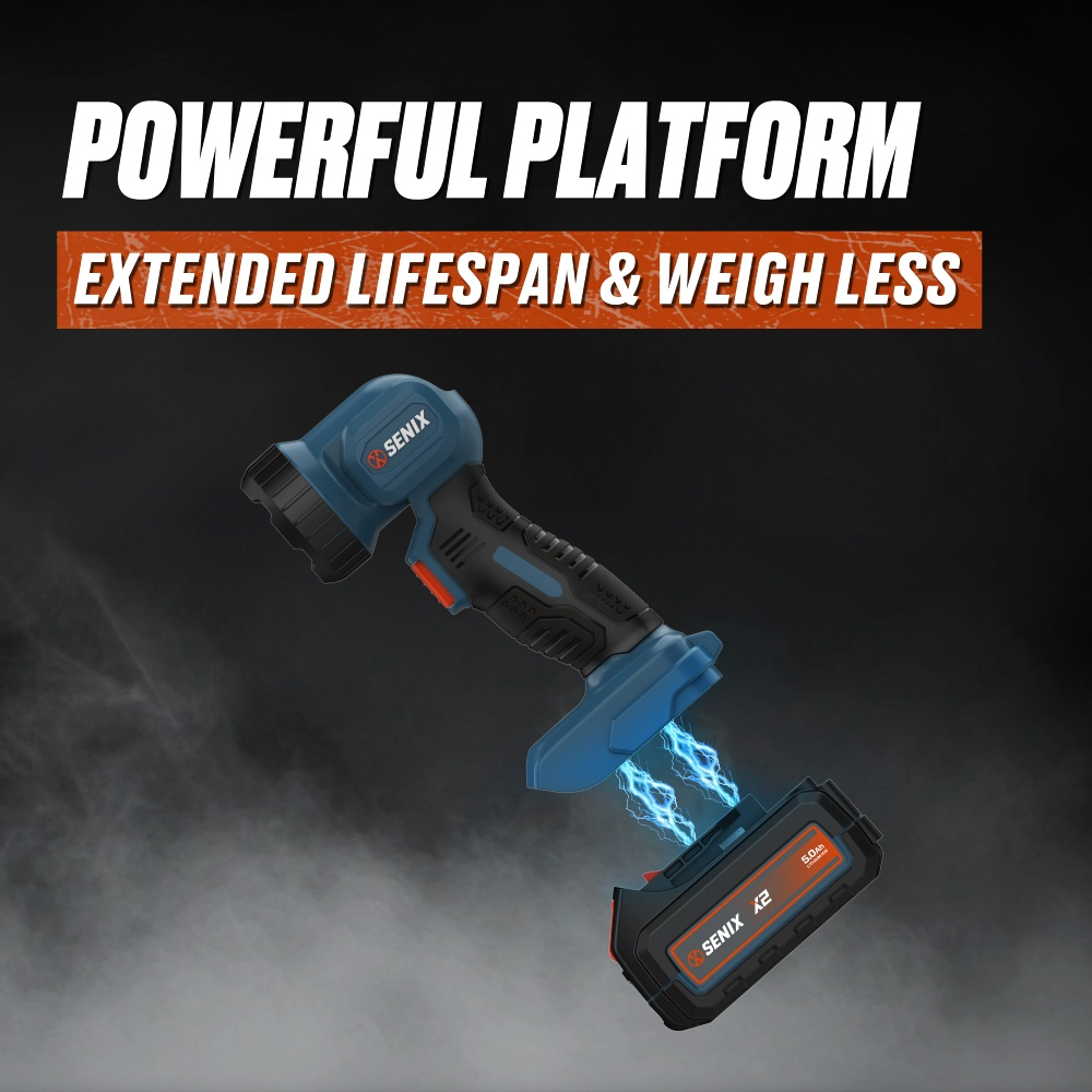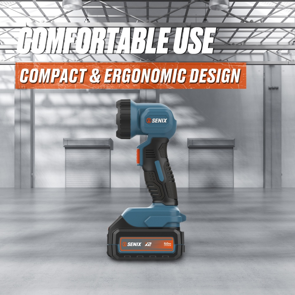 (5.0)The SENIX 20V Cordless Flashlight delivers 200 lumens of bright LED light with a 120° rotating head for flexible direction. Compact, ergonomic, and lightweight, it runs up to 34 hours on a 5.0Ah battery. Ideal for home, workshop, or outdoor use, it brings light exactly where you need it.