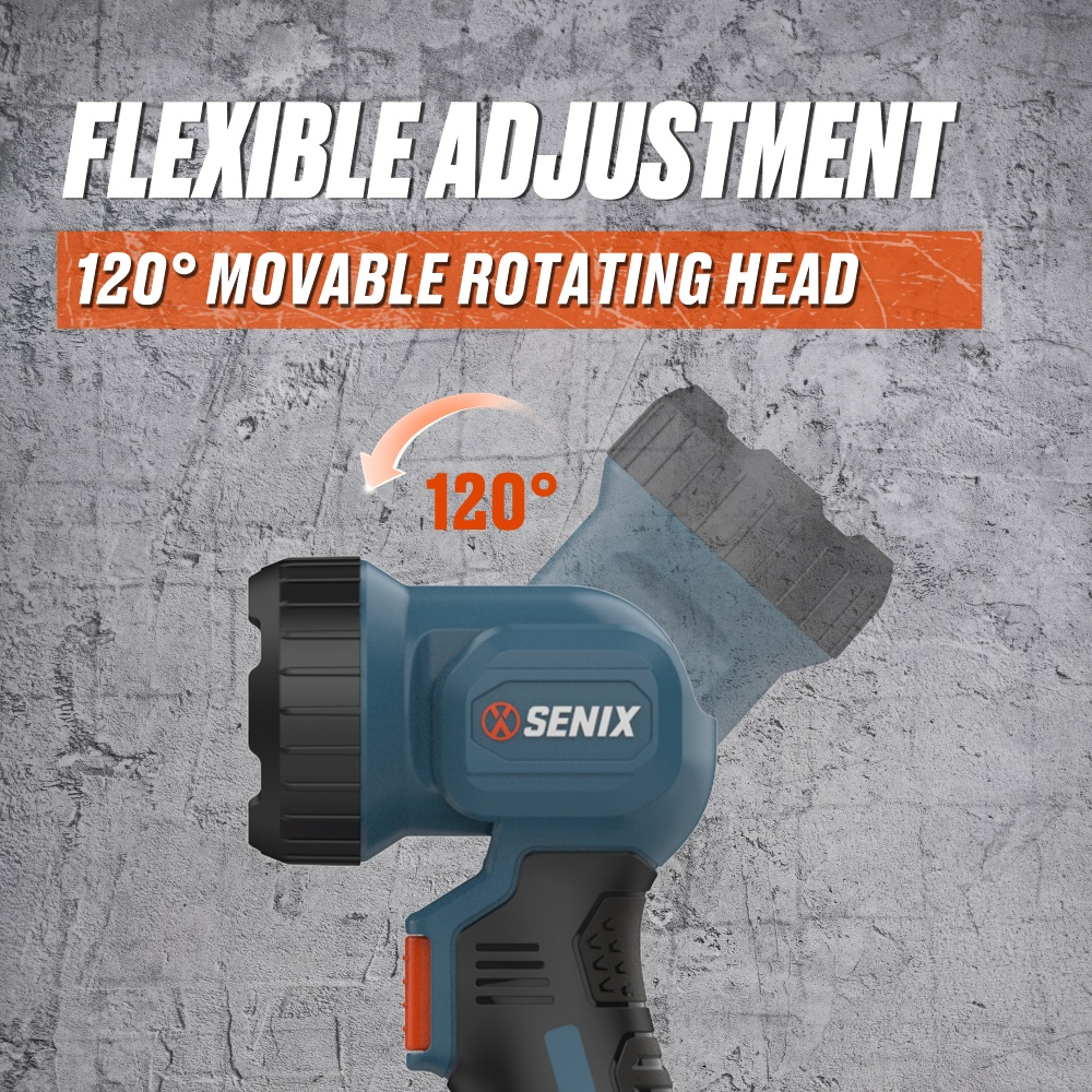 The SENIX 20V Cordless Flashlight is your dependable companion for both everyday tasks and demanding work conditions. Designed with a high-efficiency LED bulb that outputs 200 lumens, this flashlight delivers powerful and focused lighting, ideal for dark corners, job sites, garages, or power outages. Its 120° rotating head offers adjustable illumination angles, making it easier to focus light exactly where you need it.