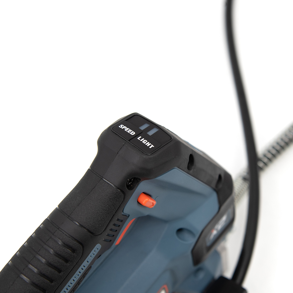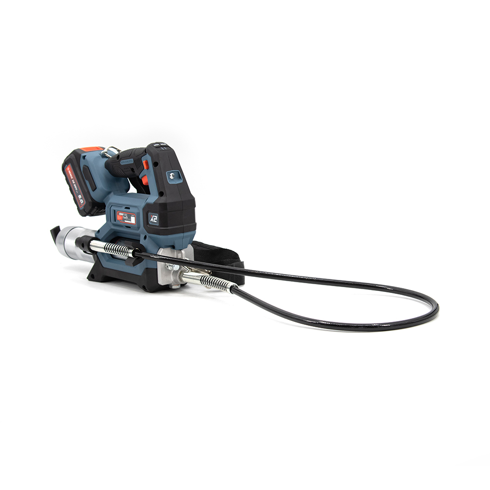 Designed for comfort and convenience, the tool features a lock-on/lock-off trigger, a 48-inch flexible hose for improved access, and an air bleeder valve that primes the pump quickly, minimizing downtime. The brushless motor ensures maximum power with extended runtime and durability. Its versatile loading system accommodates both 455g bulk grease and 410g cartridges.