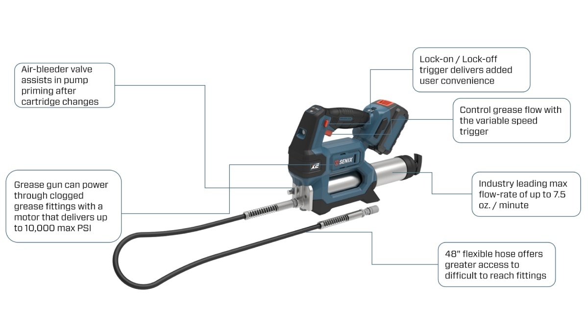 (5.0)The SENIX 20V Brushless Grease Gun delivers 10,000 PSI pressure and up to 10 oz/min flow rate, making it ideal for industrial-grade lubrication. Its pre-set grease dial, air bleeder valve, and 48" flexible hose ensure precision, ease, and efficiency on every job.