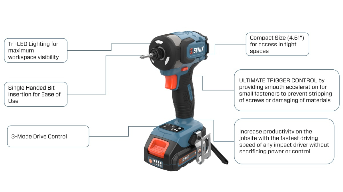 (5.0)The SENIX Brushless 250Nm(185 ft.-lbs) Compact Impact Driver is a high-performance 20V brushless impact driver engineered for demanding fastening applications. Featuring a powerful 250Nm torque output, compact design, and 3-mode control, it provides maximum speed and precision in tight spaces—ideal for professionals who require portability without compromising power.