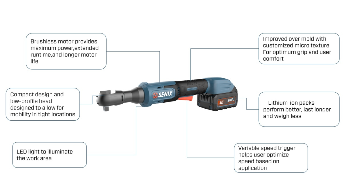 (5.0)The SENIX 20V Brushless 3/8'' Ratchet Wrench delivers 75Nm of controlled torque in a compact and ergonomic form. Designed for demanding fastening tasks in confined spaces, it features a brushless motor, variable speed control, LED lighting, and a durable grip — perfect for automotive, assembly, and general maintenance work.