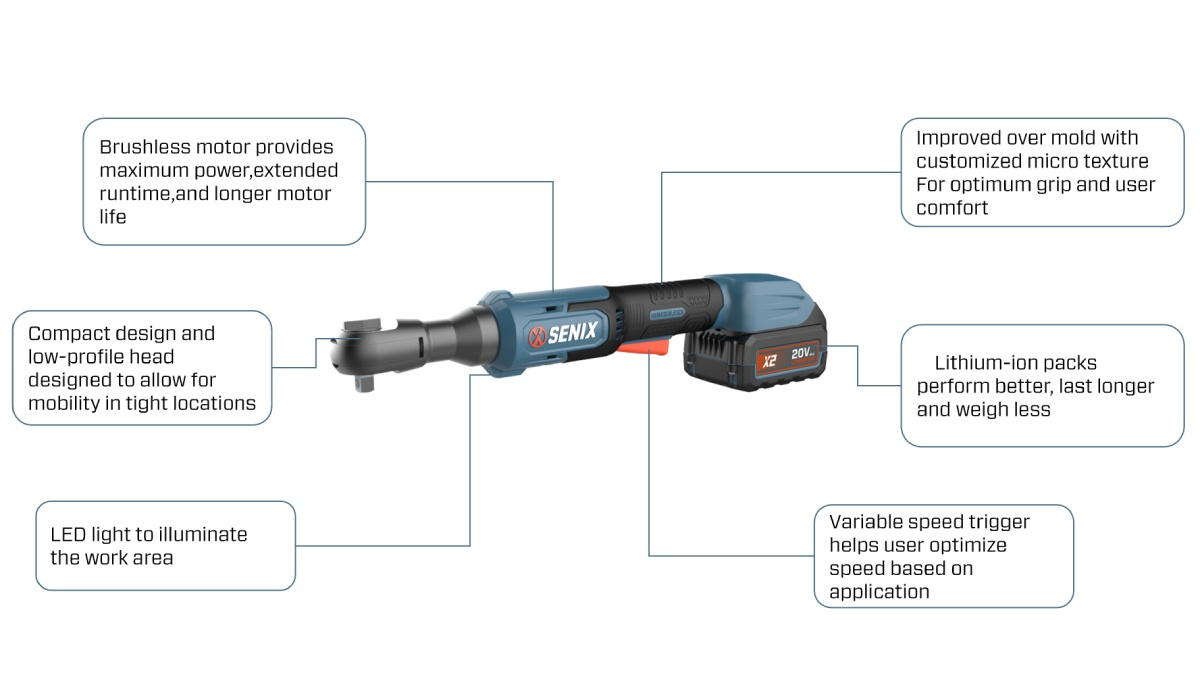 (5.0)The SENIX 20V Brushless 1/2" Ratchet Wrench offers compact power and precision. With a brushless motor, variable speed control, and ergonomic grip, it’s ideal for automotive, assembly, and repair tasks. Its low-profile head and built-in LED make it the perfect choice for work in tight, poorly lit spaces.
