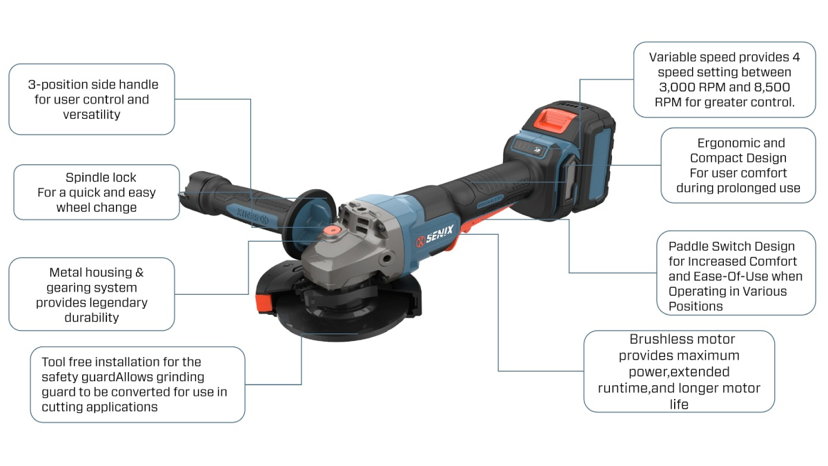 The SENIX 20V Brushless 115mm (4-1/2'') Paddle Switch Angle Grinder is engineered to deliver professional-grade performance with compact, user-friendly design. Weighing just 1.9 kg (tool only), this grinder is built for maximum control, comfort, and cutting efficiency.