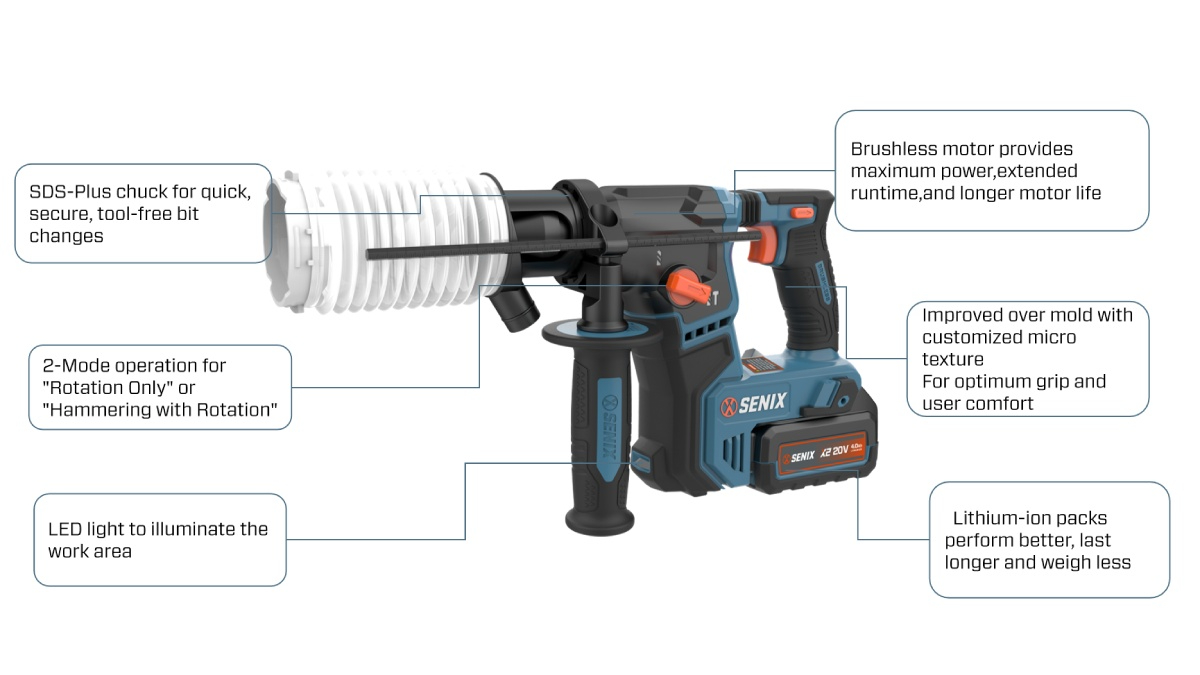 (5.0)Meet your go-to tool for concrete and masonry: the SENIX 20V Brushless Rotary Hammer. Built for performance, this compact beast features 1.2J of impact energy, SDS-Plus convenience, and versatile 2-mode operation. Whether you're anchoring into concrete or drilling into wood, SENIX makes it faster, easier, and cleaner.