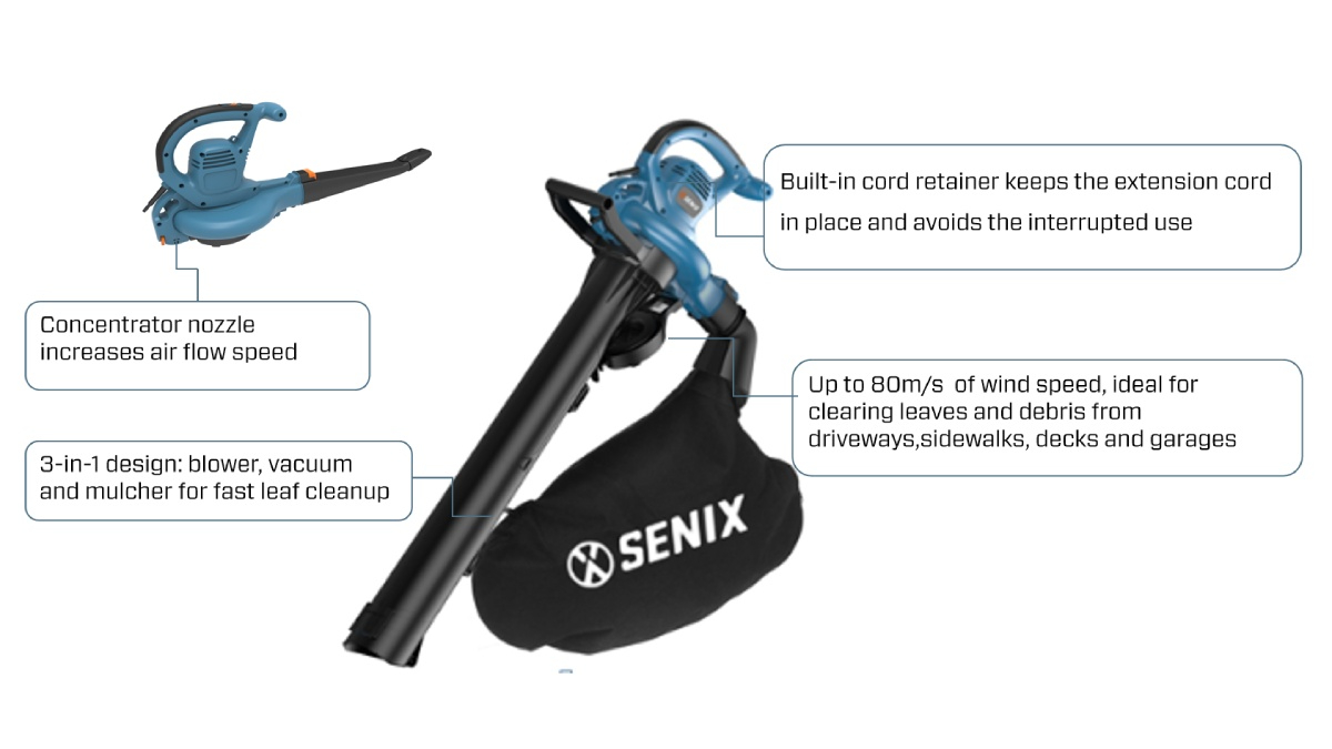 (5.0)The SENIX 2600W Blower/Vacuum offers powerful 3-in-1 functionality, combining blower, vacuum, and mulcher for fast and efficient leaf cleanup. With a 14:1 mulching ratio, 45L collection bag, variable speed control, and concentrator nozzle for increased airflow, it's lightweight, portable, and ideal for driveways, decks, sidewalks, and garages. Built for convenience and professional-grade performance.