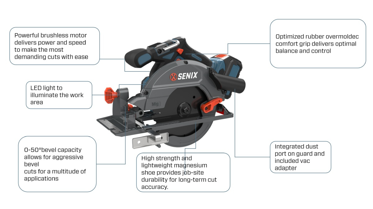 The SENIX 20V Brushless 165mm (6-1/2") Circular Saw is engineered for serious cutting performance across a variety of materials. Designed with a high-efficiency brushless motor, this circular saw offers powerful, consistent output while improving runtime and motor longevity. With a bevel capacity ranging from 0° to 50°, it supports a wide range of angled cuts, making it suitable for everything from structural framing to trim work.