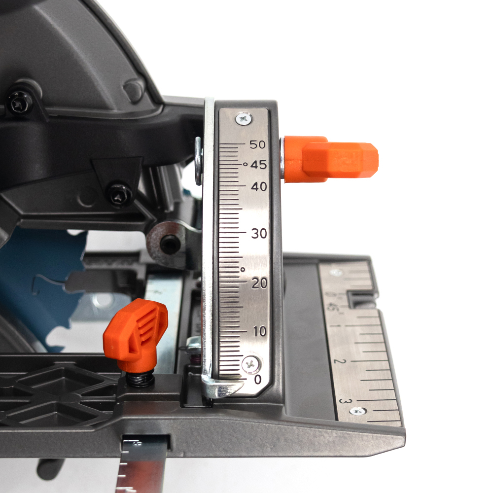 The 165mm blade enables a cutting depth of 56mm at 90° and 41mm at 45°, while its arbor size of 20mm ensures compatibility with standard blades. The saw features a built-in LED light for increased visibility and a user-friendly over mold handle with micro-texture for enhanced grip and control during extended use.