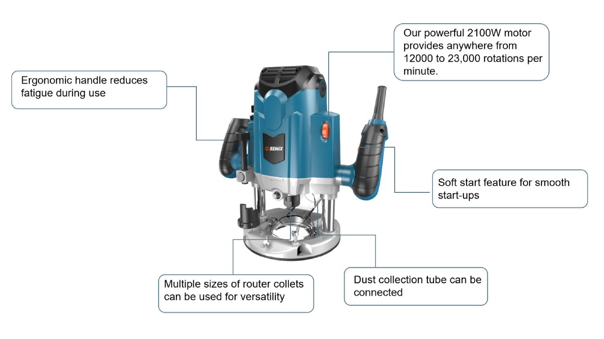 (5.0)The SENIX 2100W 12mm (15/32") Router delivers professional-grade performance with 12,000–23,000 RPM, a soft start for smooth operation, and ergonomic handle design to reduce user fatigue. Compatible with multiple collet sizes and equipped with a dust collection tube, it ensures precision, versatility, and a cleaner workspace for woodworking projects of all types.