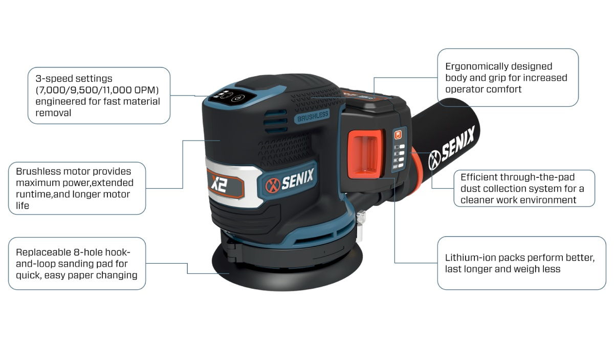 The SENIX 20V Brushless Random Orbit Sander combines powerful performance with precise control for demanding sanding applications. Featuring a durable brushless motor, this cordless sander delivers a no-load speed of 7,000 to 11,000 orbits per minute (OPM) with three variable speed settings, giving you the flexibility to tackle wood, metal, and painted surfaces with ease.