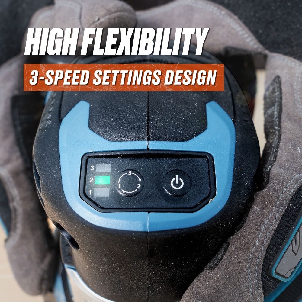 The generous 125mm sanding pad with a 3.2mm orbit diameter provides rapid material removal and smooth finishing, while the 8-hole hook-and-loop design allows quick paper changes to keep you working efficiently. An ergonomically designed body with soft overmold ensures user comfort and secure handling, even during extended sessions.