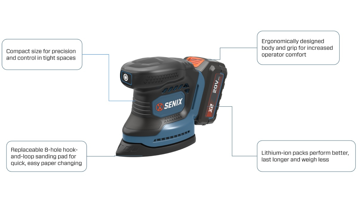 (5.0)The SENIX 20V Brushed Orbit Detail Sander offers the perfect balance of power and precision for intricate sanding tasks. Lightweight, cordless, and built for tight corners, it delivers 11,000 OPM of consistent sanding. Ergonomic design and fast pad changes make it ideal for both pros and passionate DIYers.