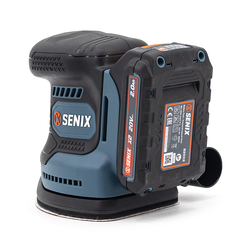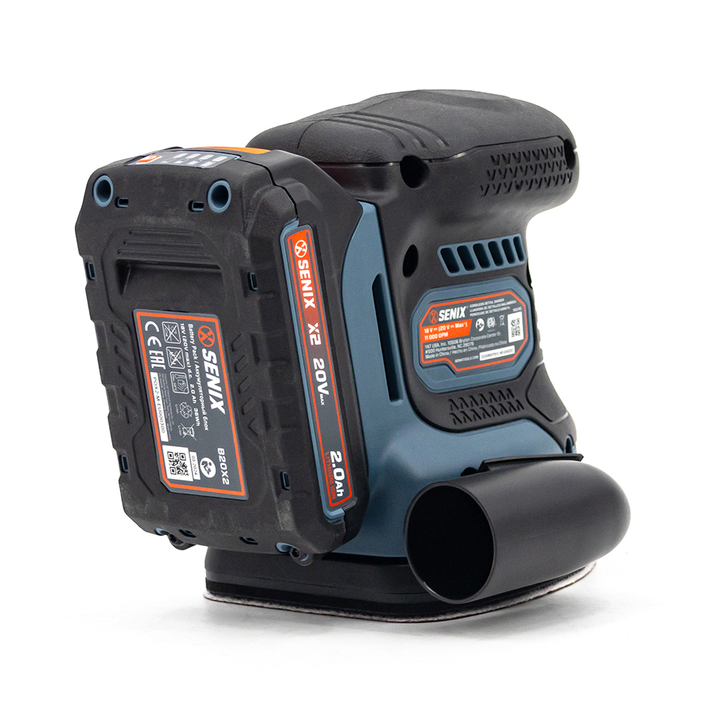 A: With a 5Ah SENIX lithium-ion battery, you can expect around 30–40 minutes of continuous sanding, depending on material and pressure applied.