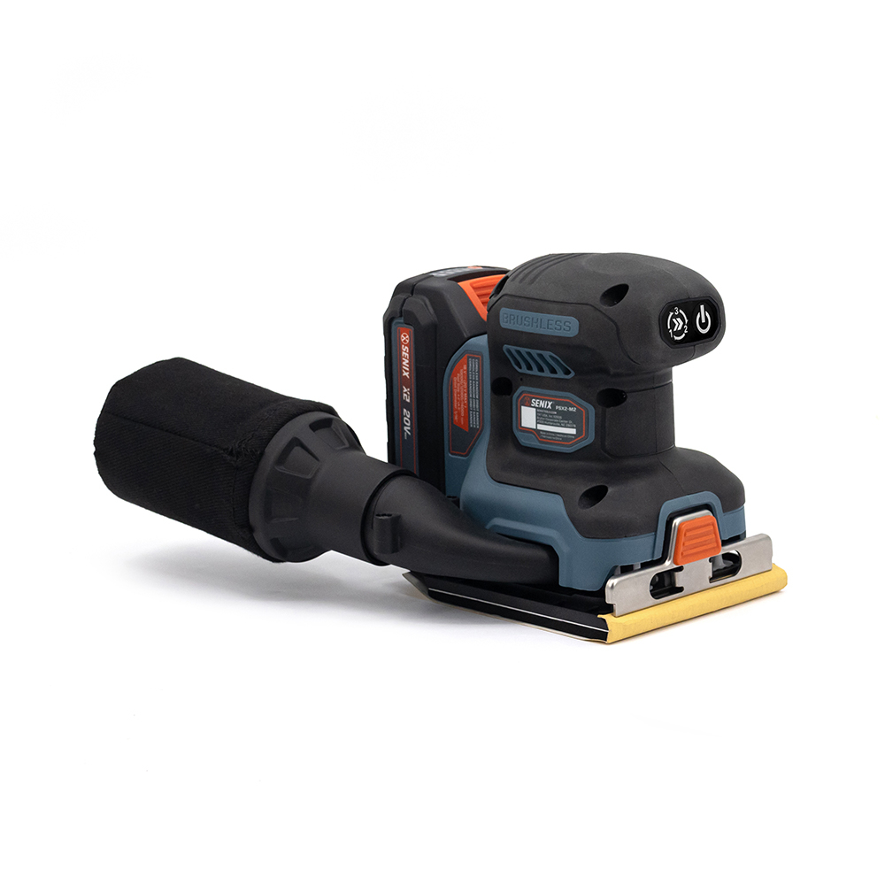 The SENIX 20V Brushless Sheet Sander is built for smooth performance, efficient material removal, and user-friendly control. Powered by a high-performance brushless motor, this cordless sander delivers consistent power and extended runtime—ideal for woodworkers, DIYers, and renovation pros. With a compact, lightweight build (1.1 kg) and ergonomic rubber grip, it minimizes fatigue and maximizes maneuverability across large or intricate surfaces.