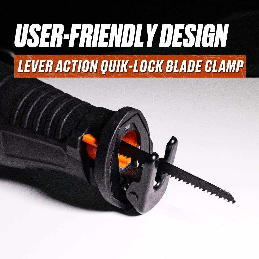 A generous 26mm (1") stroke length provides aggressive material removal, while the variable speed trigger lets you adapt on the fly for delicate or dense materials. Thanks to the lever-action Quik-Lock blade clamp, changing blades takes seconds—no tools needed.