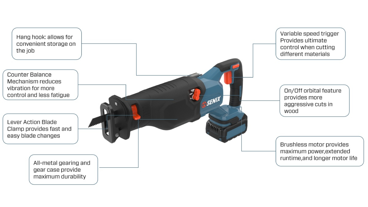 (5.0)Rip through wood and steel with the SENIX 20V 32mm Reciprocating Saw—brushless power, orbital mode,
