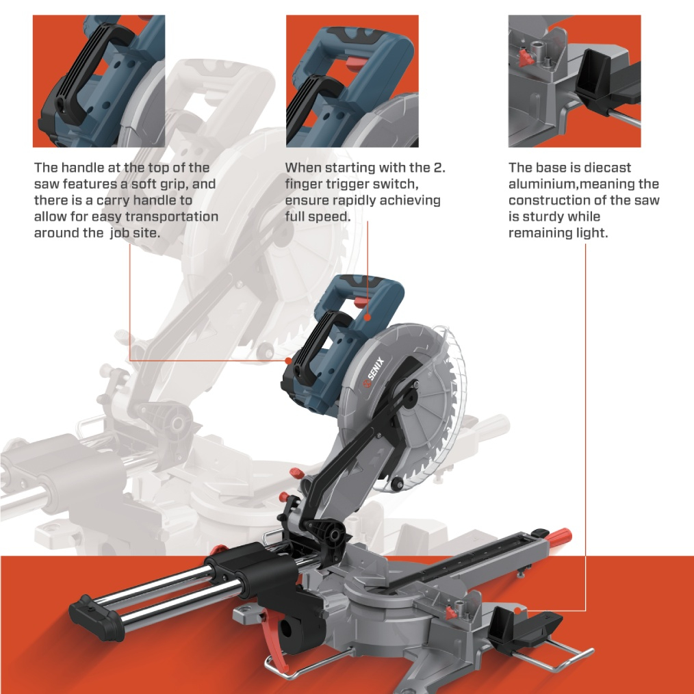 (5.0)The SENIX 1800W 255mm (10") Miter Saw delivers precision, power, and portability for professional and DIY woodworking. With a sturdy yet lightweight die-cast aluminum base, soft-grip top handle, and 2-finger trigger for rapid speed, it provides clean, accurate cuts at multiple miter and bevel angles. Perfect for trimming, framing, and angled cuts on wood and composite materials.
