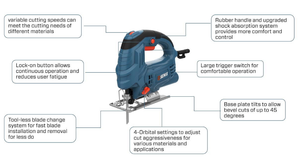 (5.0)The SENIX 550W 20mm (25/32") Jig Saw offers precision, versatility, and comfort for professional and DIY projects. With variable speeds, 4 orbital settings, and a tilting base for bevel cuts up to 45°, it adapts easily to different materials. Tool-less blade changes, a rubberized handle, and shock absorption ensure smooth, fatigue-free operation.