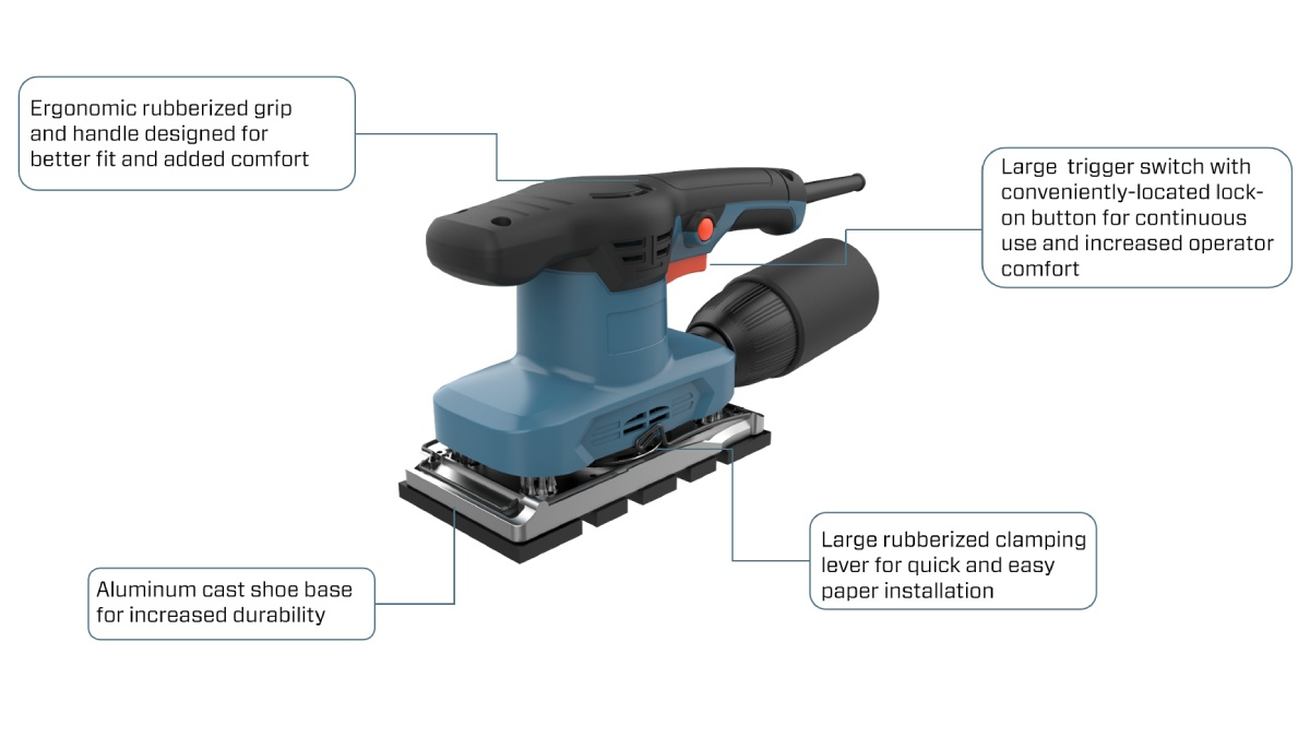 Ergonomic Rubberized Grip & Handle – Designed for a better fit, added comfort, and reduced fatigue during long sanding sessions.