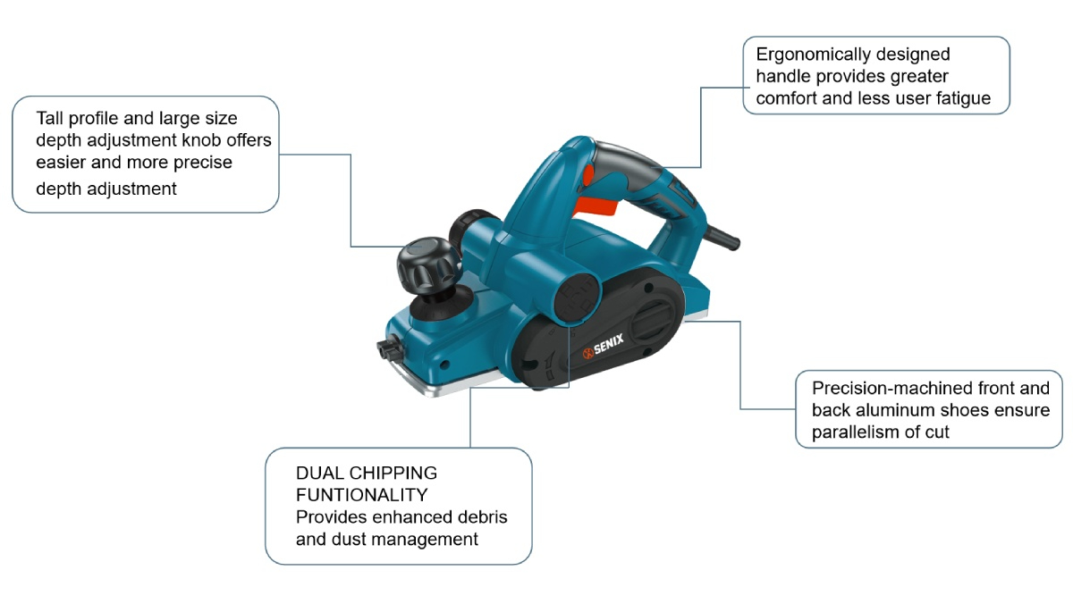(5.0)The SENIX 710W 82mm (3-1/4") Planer combines power, precision, and comfort for professional woodworking. Featuring dual chipping functionality for improved dust management, precision-machined aluminum shoes for parallel cuts, and an ergonomic handle to reduce fatigue, it offers precise depth and rabeting control. Its 16,500 RPM motor ensures efficient, smooth planing for high-quality surface finishing.