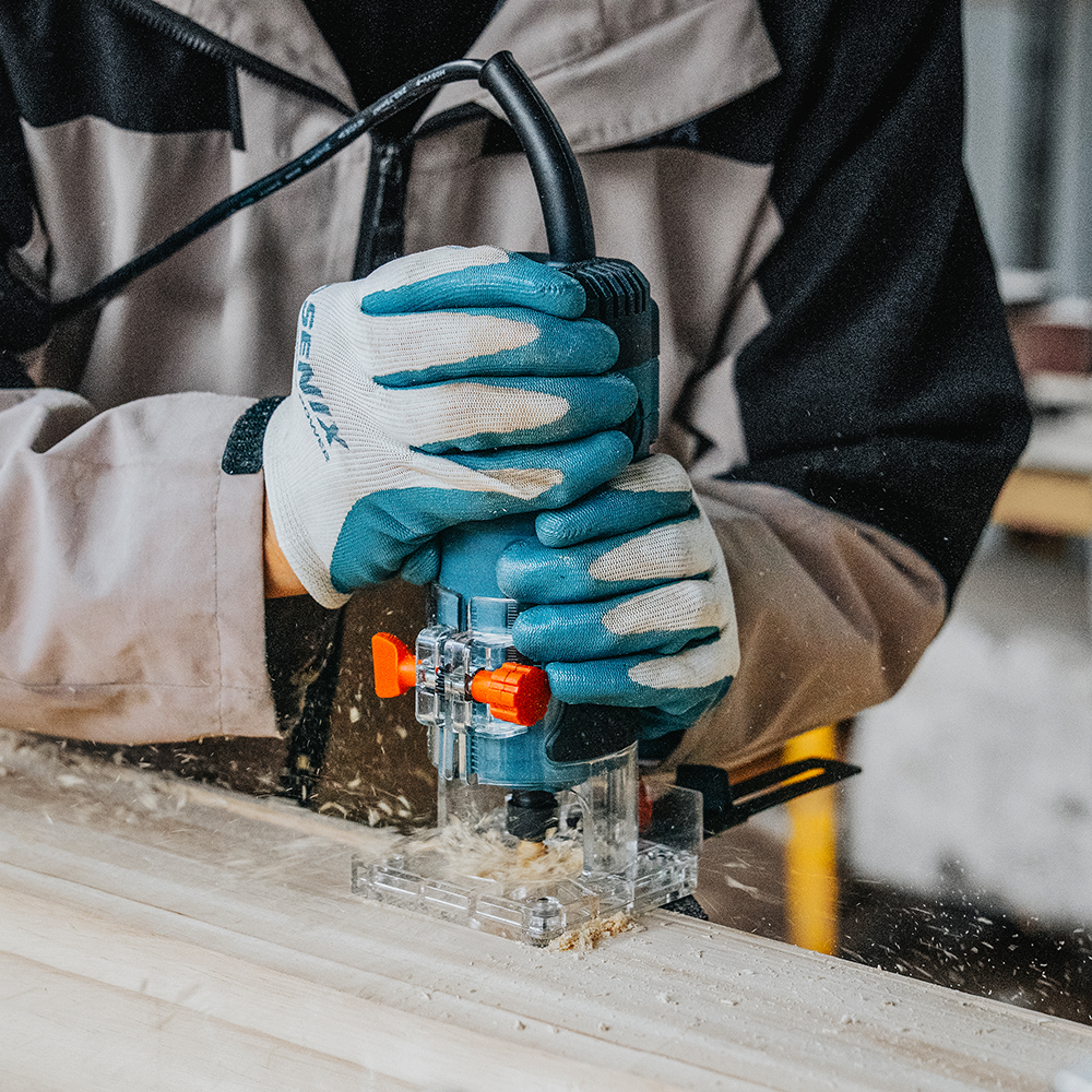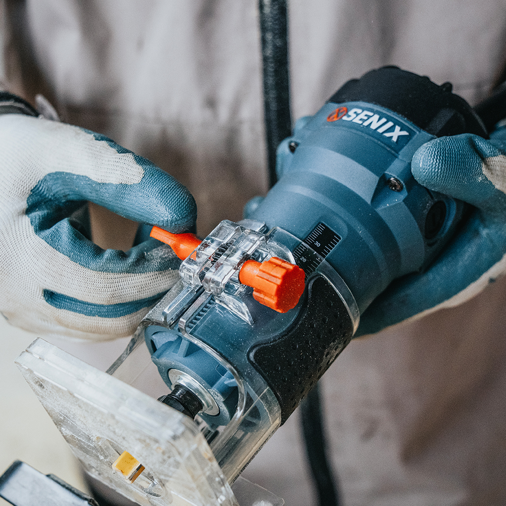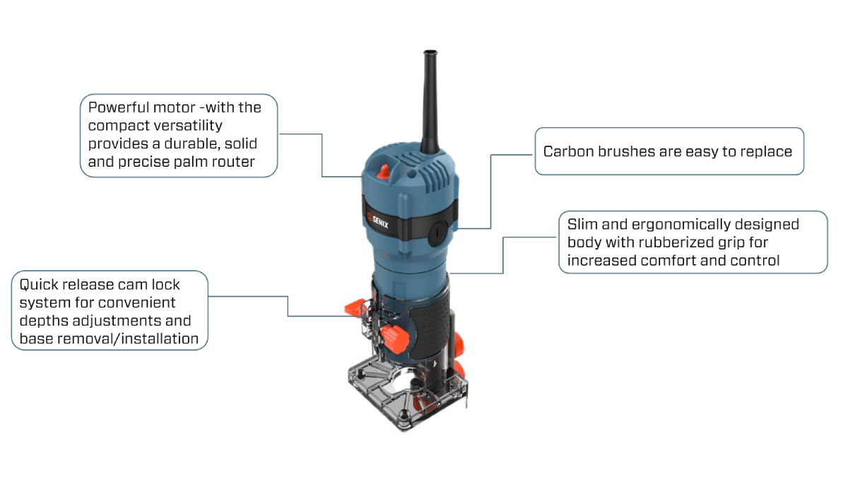 (5.0)The SENIX 510W 6mm (1/4") Palm Router delivers high-speed precision and compact versatility for professional and DIY woodworking. Featuring a 35,000 RPM motor, quick-release cam lock for easy depth adjustment, durable spindle lock for fast bit changes, and a slim rubberized ergonomic body, it ensures comfort, control, and efficient routing in tight spaces and detailed projects.